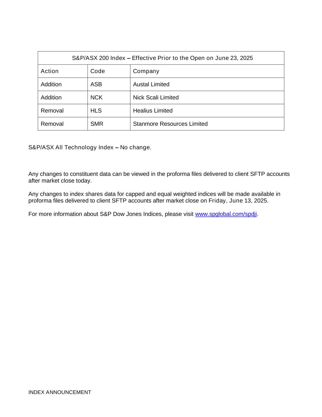 INDEX ANNOUNCEMENT S&P/ASX 200 Index – Effective Prior to the Open on June 23, 2025 Action Code Company Addition ASB Austal Limited Addition NCK Nick Scali Limited Removal HLS Healius Limited Removal SMR Stanmore Resources Limited S&P/ASX All Technology Index – No change. Any changes to constituent data can be viewed in the proforma files delivered to client SFTP accounts after market close today. Any changes to index shares data for capped and equal weighted indices will be made available in proforma files delivered to client SFTP accounts after market close on Friday, June 13, 2025. For more information about S&P Dow Jones Indices, please visit www.spglobal.com/spdji.