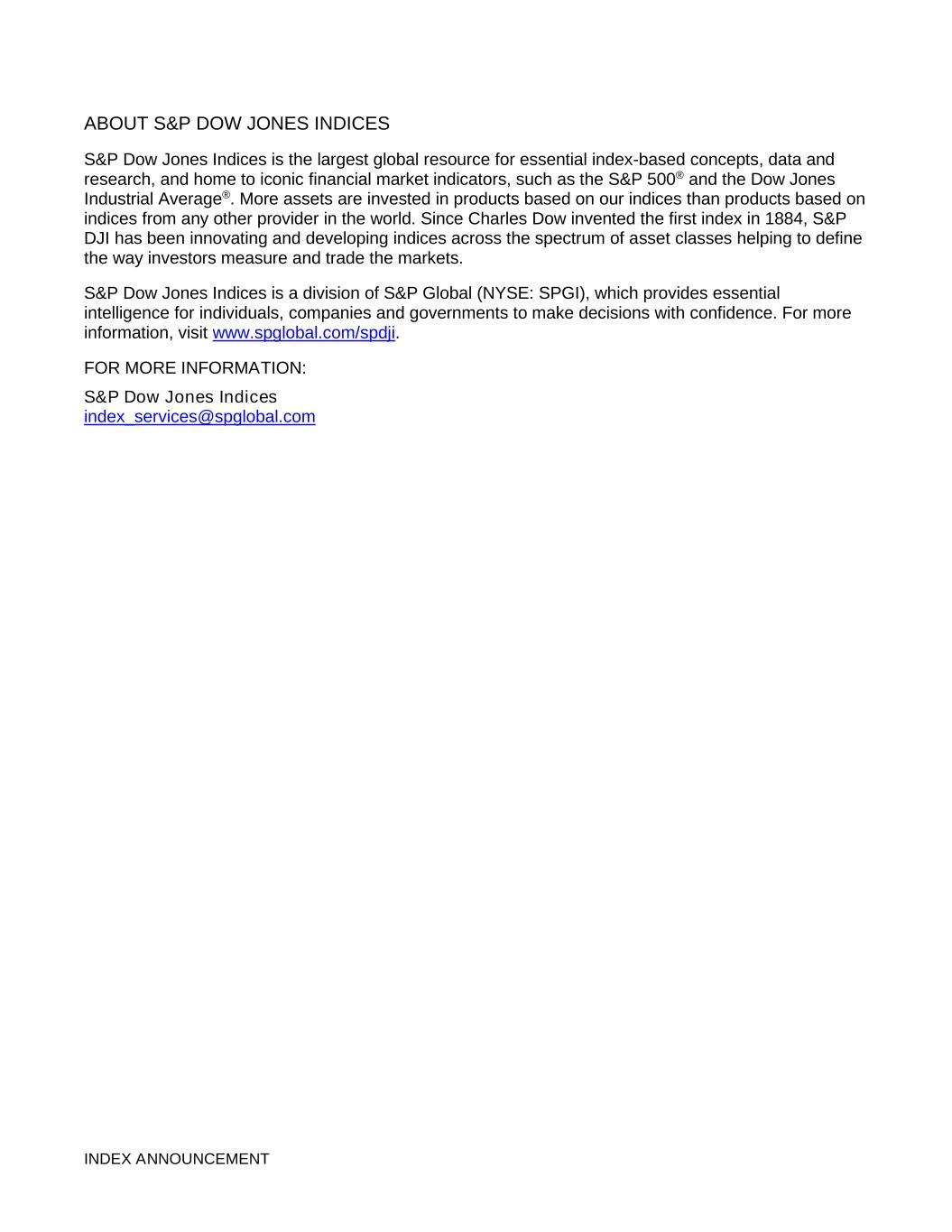 INDEX ANNOUNCEMENT ABOUT S&P DOW JONES INDICES S&P Dow Jones Indices is the largest global resource for essential index-based concepts, data and research, and home to iconic financial market indicators, such as the S&P 500® and the Dow Jones Industrial Average®. More assets are invested in products based on our indices than products based on indices from any other provider in the world. Since Charles Dow invented the first index in 1884, S&P DJI has been innovating and developing indices across the spectrum of asset classes helping to define the way investors measure and trade the markets. S&P Dow Jones Indices is a division of S&P Global (NYSE: SPGI), which provides essential intelligence for individuals, companies and governments to make decisions with confidence. For more information, visit www.spglobal.com/spdji. FOR MORE INFORMATION: S&P Dow Jones Indices index_services@spglobal.com