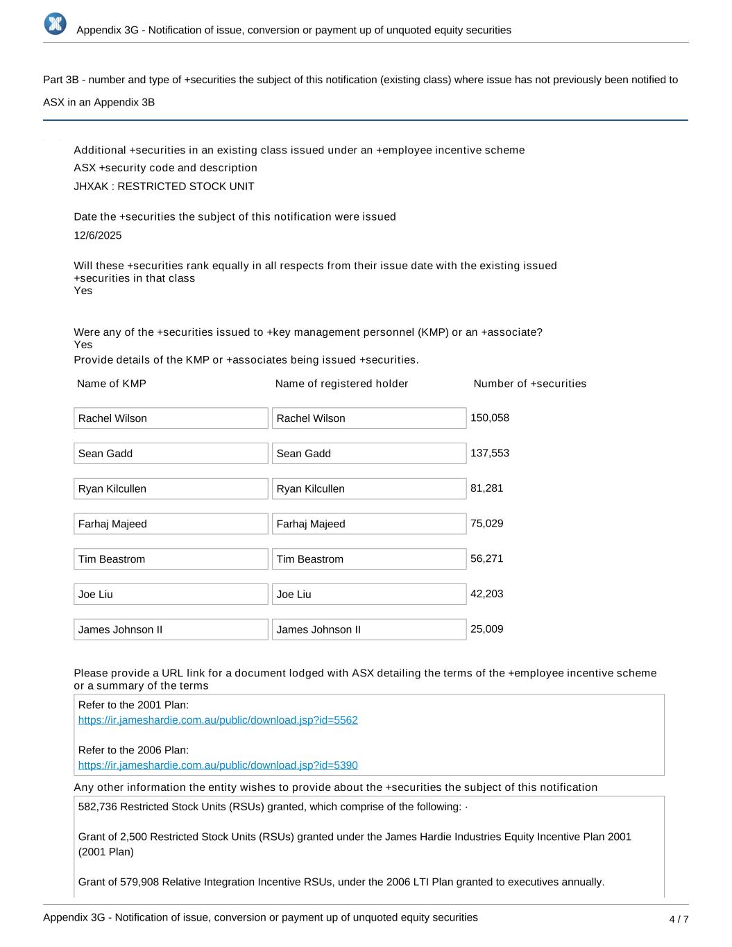 Appendix 3G - Notification of issue, conversion or payment up of unquoted equity securities Appendix 3G - Notification of issue, conversion or payment up of unquoted equity securities 4 / 7 Part 3B - number and type of +securities the subject of this notification (existing class) where issue has not previously been notified to ASX in an Appendix 3B Additional +securities in an existing class issued under an +employee incentive scheme ASX +security code and description JHXAK : RESTRICTED STOCK UNIT Date the +securities the subject of this notification were issued 12/6/2025 Will these +securities rank equally in all respects from their issue date with the existing issued +securities in that class Were any of the +securities issued to +key management personnel (KMP) or an +associate? Provide details of the KMP or +associates being issued +securities. Name of KMP Name of registered holder Number of +securities Rachel Wilson Rachel Wilson 150,058 Sean Gadd Sean Gadd 137,553 Ryan Kilcullen Ryan Kilcullen 81,281 Farhaj Majeed Farhaj Majeed 75,029 Tim Beastrom Tim Beastrom 56,271 Joe Liu Joe Liu 42,203 James Johnson II James Johnson II 25,009 Please provide a URL link for a document lodged with ASX detailing the terms of the +employee incentive scheme or a summary of the terms Refer to the 2001 Plan: https://ir.jameshardie.com.au/public/download.jsp?id=5562 Refer to the 2006 Plan: https://ir.jameshardie.com.au/public/download.jsp?id=5390 Any other information the entity wishes to provide about the +securities the subject of this notification 582,736 Restricted Stock Units (RSUs) granted, which comprise of the following: ·  Grant of 2,500 Restricted Stock Units (RSUs) granted under the James Hardie Industries Equity Incentive Plan 2001 (2001 Plan)        Grant of 579,908 Relative Integration Incentive RSUs, under the 2006 LTI Plan granted to executives annually. Yes Yes