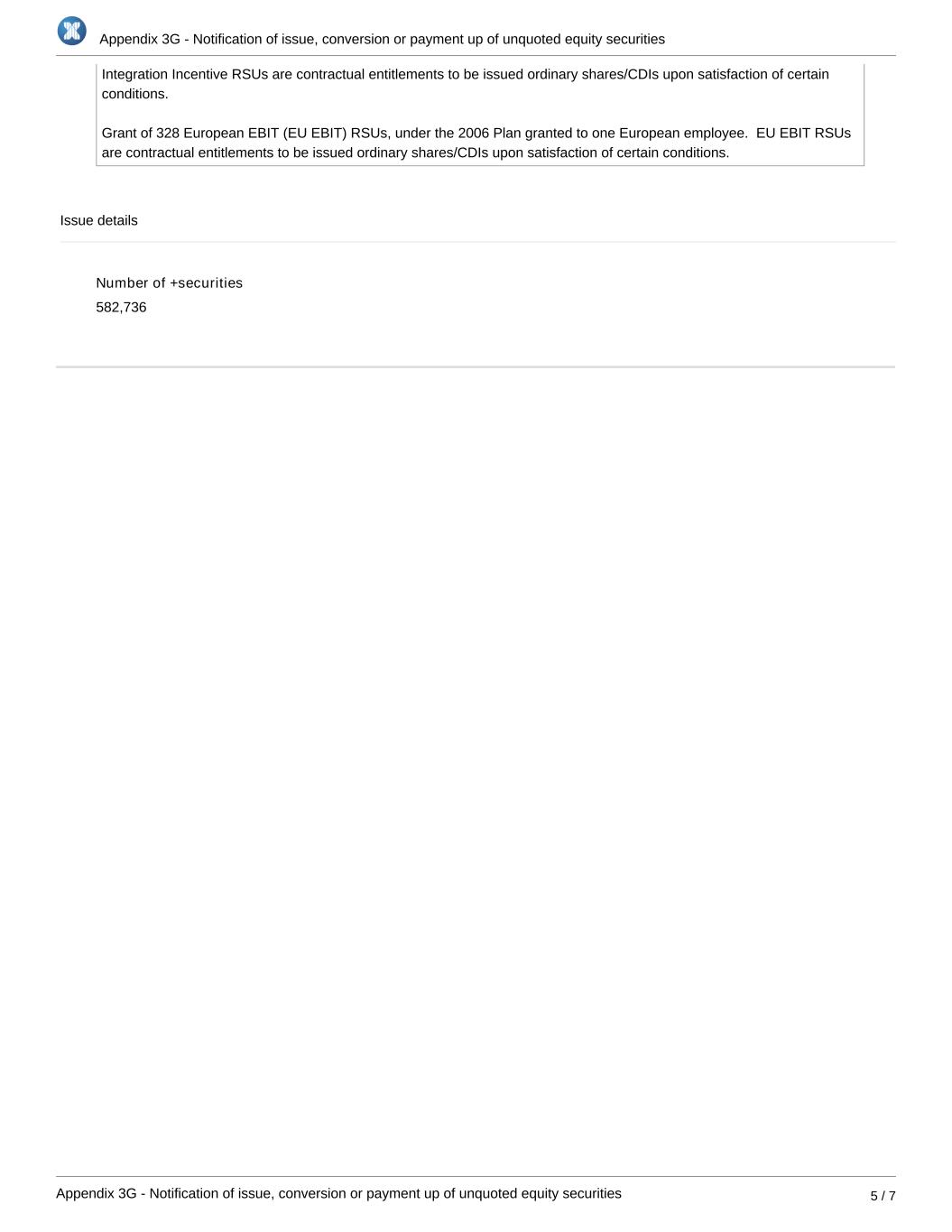 Appendix 3G - Notification of issue, conversion or payment up of unquoted equity securities Appendix 3G - Notification of issue, conversion or payment up of unquoted equity securities 5 / 7 Integration Incentive RSUs are contractual entitlements to be issued ordinary shares/CDIs upon satisfaction of certain conditions. Grant of 328 European EBIT (EU EBIT) RSUs, under the 2006 Plan granted to one European employee. EU EBIT RSUs are contractual entitlements to be issued ordinary shares/CDIs upon satisfaction of certain conditions. Issue details Number of +securities 582,736