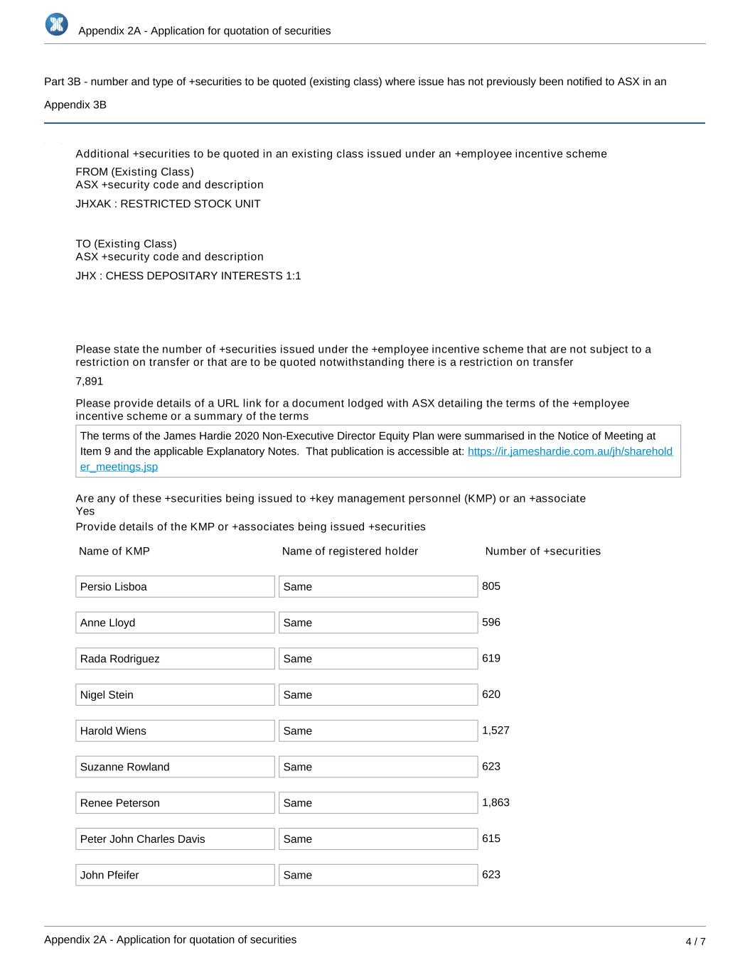 Appendix 2A - Application for quotation of securities Appendix 2A - Application for quotation of securities 4 / 7 Part 3B - number and type of +securities to be quoted (existing class) where issue has not previously been notified to ASX in an Appendix 3B Additional +securities to be quoted in an existing class issued under an +employee incentive scheme FROM (Existing Class) ASX +security code and description JHXAK : RESTRICTED STOCK UNIT TO (Existing Class) ASX +security code and description JHX : CHESS DEPOSITARY INTERESTS 1:1 Please state the number of +securities issued under the +employee incentive scheme that are not subject to a restriction on transfer or that are to be quoted notwithstanding there is a restriction on transfer 7,891 Please provide details of a URL link for a document lodged with ASX detailing the terms of the +employee incentive scheme or a summary of the terms The terms of the James Hardie 2020 Non-Executive Director Equity Plan were summarised in the Notice of Meeting at Item 9 and the applicable Explanatory Notes. That publication is accessible at: https://ir.jameshardie.com.au/jh/sharehold er_meetings.jsp Are any of these +securities being issued to +key management personnel (KMP) or an +associate Provide details of the KMP or +associates being issued +securities Name of KMP Name of registered holder Number of +securities Persio Lisboa Same 805 Anne Lloyd Same 596 Rada Rodriguez Same 619 Nigel Stein Same 620 Harold Wiens Same 1,527 Suzanne Rowland Same 623 Renee Peterson Same 1,863 Peter John Charles Davis Same 615 John Pfeifer Same 623 Issue date Yes