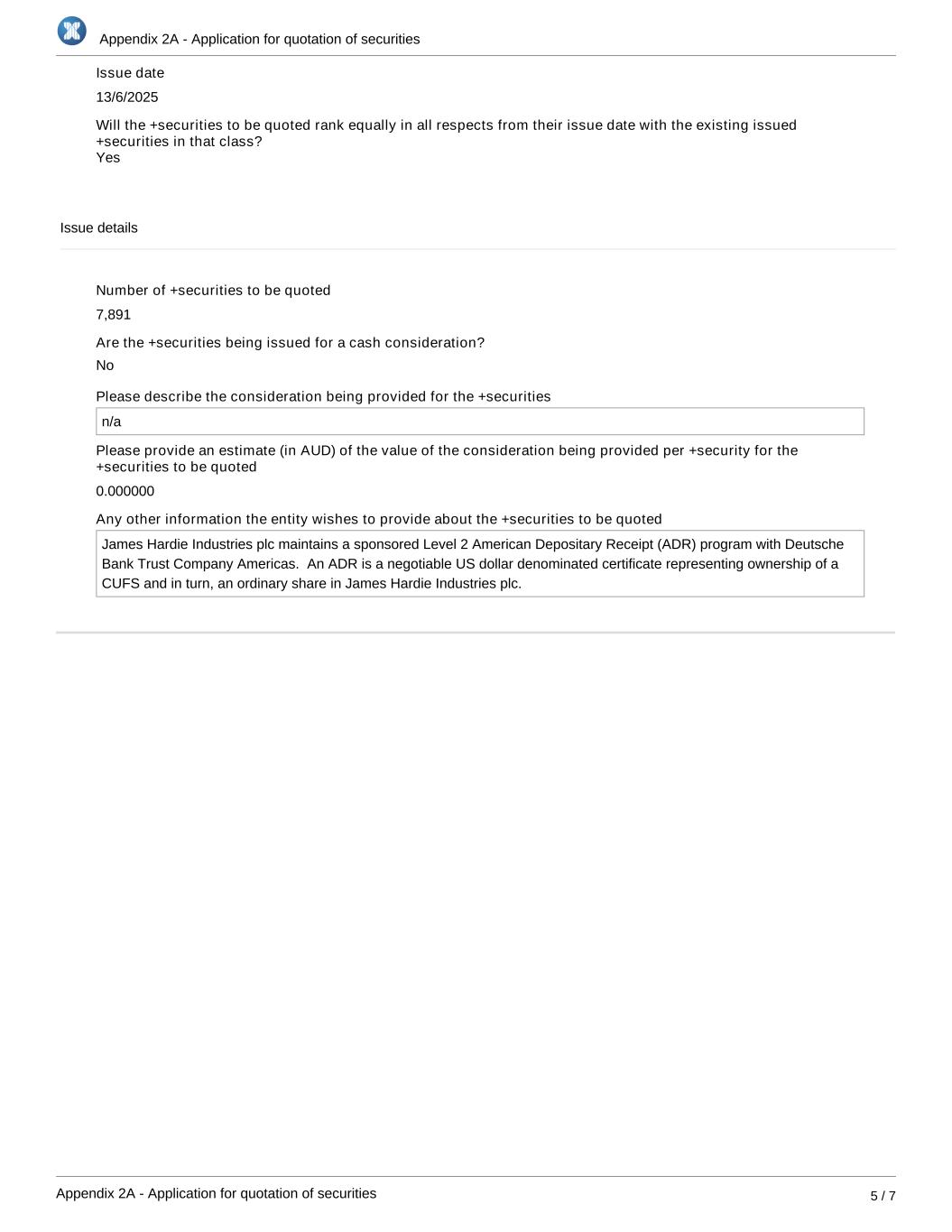 Appendix 2A - Application for quotation of securities Appendix 2A - Application for quotation of securities 5 / 7 Issue date 13/6/2025 Will the +securities to be quoted rank equally in all respects from their issue date with the existing issued +securities in that class? Issue details Number of +securities to be quoted 7,891 Are the +securities being issued for a cash consideration? Please describe the consideration being provided for the +securities n/a Please provide an estimate (in AUD) of the value of the consideration being provided per +security for the +securities to be quoted 0.000000 Any other information the entity wishes to provide about the +securities to be quoted James Hardie Industries plc maintains a sponsored Level 2 American Depositary Receipt (ADR) program with Deutsche Bank Trust Company Americas. An ADR is a negotiable US dollar denominated certificate representing ownership of a CUFS and in turn, an ordinary share in James Hardie Industries plc. No Yes