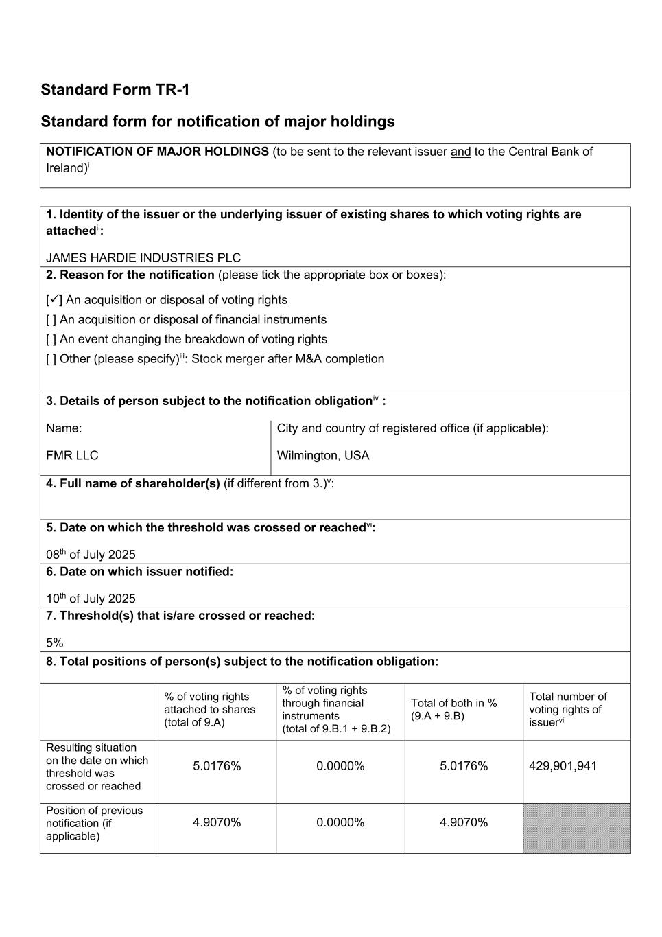 Standard Form TR-1 Standard form for notification of major holdings NOTIFICATION OF MAJOR HOLDINGS (to be sent to the relevant issuer and to the Central Bank of Ireland)i 1. Identity of the issuer or the underlying issuer of existing shares to which voting rights are attachedii: JAMES HARDIE INDUSTRIES PLC 2. Reason for the notification (please tick the appropriate box or boxes): [✓] An acquisition or disposal of voting rights [ ] An acquisition or disposal of financial instruments [ ] An event changing the breakdown of voting rights [ ] Other (please specify)iii: Stock merger after M&A completion 3. Details of person subject to the notification obligationiv : Name: FMR LLC City and country of registered office (if applicable): Wilmington, USA 4. Full name of shareholder(s) (if different from 3.)v: 5. Date on which the threshold was crossed or reachedvi: 08th of July 2025 6. Date on which issuer notified: 10th of July 2025 7. Threshold(s) that is/are crossed or reached: 5% 8. Total positions of person(s) subject to the notification obligation: % of voting rights attached to shares (total of 9.A) % of voting rights through financial instruments (total of 9.B.1 + 9.B.2) Total of both in % (9.A + 9.B) Total number of voting rights of issuervii Resulting situation on the date on which threshold was crossed or reached 5.0176% 0.0000% 5.0176% 429,901,941 Position of previous notification (if applicable) 4.9070% 0.0000% 4.9070%