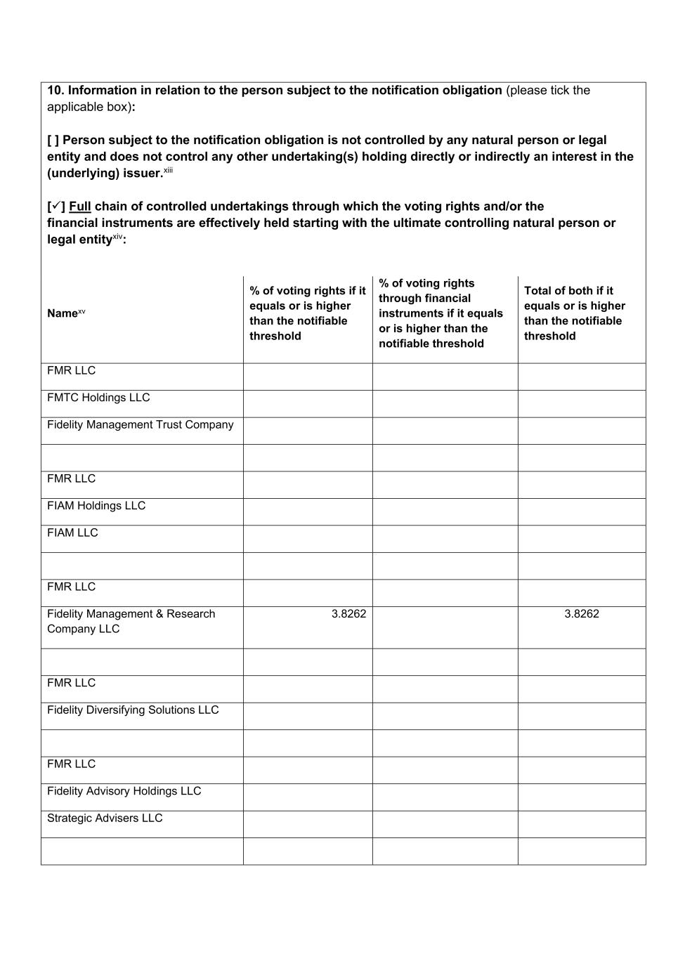 10. Information in relation to the person subject to the notification obligation (please tick the applicable box): [ ] Person subject to the notification obligation is not controlled by any natural person or legal entity and does not control any other undertaking(s) holding directly or indirectly an interest in the (underlying) issuer.xiii [✓] Full chain of controlled undertakings through which the voting rights and/or the financial instruments are effectively held starting with the ultimate controlling natural person or legal entityxiv: Namexv % of voting rights if it equals or is higher than the notifiable threshold % of voting rights through financial instruments if it equals or is higher than the notifiable threshold Total of both if it equals or is higher than the notifiable threshold FMR LLC FMTC Holdings LLC Fidelity Management Trust Company FMR LLC FIAM Holdings LLC FIAM LLC FMR LLC Fidelity Management & Research Company LLC 3.8262 3.8262 FMR LLC Fidelity Diversifying Solutions LLC FMR LLC Fidelity Advisory Holdings LLC Strategic Advisers LLC