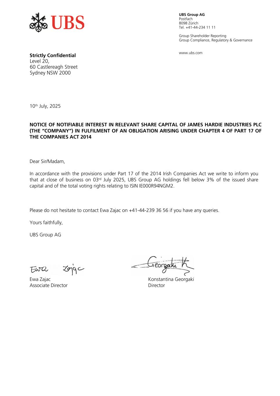 UBS Group AG Postfach 8098 Zürich Tel. +41-44-234 11 11 Group Shareholder Reporting Group Compliance, Regulatory & Governance www.ubs.com Dear Sir/Madam, In accordance with the provisions under Part 17 of the 2014 Irish Companies Act we write to inform you that at close of business on 03rd July 2025, UBS Group AG holdings fell below 3% of the issued share capital and of the total voting rights relating to ISIN IE000R94NGM2. Please do not hesitate to contact Ewa Zajac on +41-44-239 36 56 if you have any queries. Yours faithfully, UBS Group AG Ewa Zajac Konstantina Georgaki Associate Director Director Strictly Confidential Level 20, 60 Castlereagh Street Sydney NSW 2000 10th July, 2025 NOTICE OF NOTIFIABLE INTEREST IN RELEVANT SHARE CAPITAL OF JAMES HARDIE INDUSTRIES PLC (THE “COMPANY”) IN FULFILMENT OF AN OBLIGATION ARISING UNDER CHAPTER 4 OF PART 17 OF THE COMPANIES ACT 2014