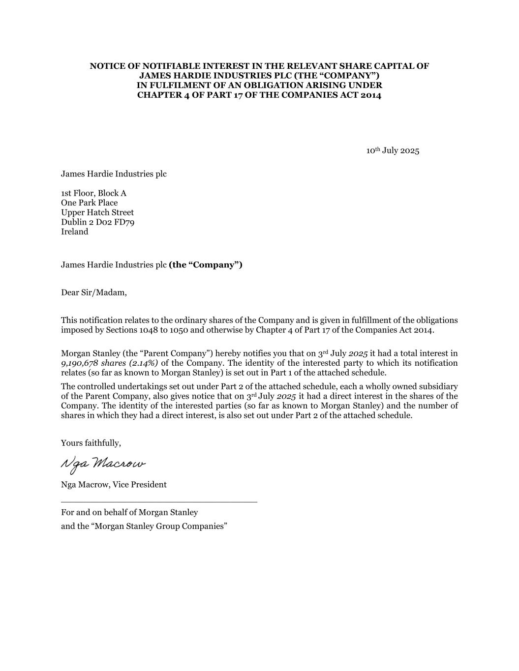 NOTICE OF NOTIFIABLE INTEREST IN THE RELEVANT SHARE CAPITAL OF JAMES HARDIE INDUSTRIES PLC (THE “COMPANY”) IN FULFILMENT OF AN OBLIGATION ARISING UNDER CHAPTER 4 OF PART 17 OF THE COMPANIES ACT 2014 10th July 2025 James Hardie Industries plc 1st Floor, Block A One Park Place Upper Hatch Street Dublin 2 D02 FD79 Ireland James Hardie Industries plc (the “Company”) Dear Sir/Madam, This notification relates to the ordinary shares of the Company and is given in fulfillment of the obligations imposed by Sections 1048 to 1050 and otherwise by Chapter 4 of Part 17 of the Companies Act 2014. Morgan Stanley (the “Parent Company”) hereby notifies you that on 3rd July 2025 it had a total interest in 9,190,678 shares (2.14%) of the Company. The identity of the interested party to which its notification relates (so far as known to Morgan Stanley) is set out in Part 1 of the attached schedule. The controlled undertakings set out under Part 2 of the attached schedule, each a wholly owned subsidiary of the Parent Company, also gives notice that on 3rd July 2025 it had a direct interest in the shares of the Company. The identity of the interested parties (so far as known to Morgan Stanley) and the number of shares in which they had a direct interest, is also set out under Part 2 of the attached schedule. Yours faithfully, Nga Macrow, Vice President ____________________________________ For and on behalf of Morgan Stanley and the “Morgan Stanley Group Companies”
