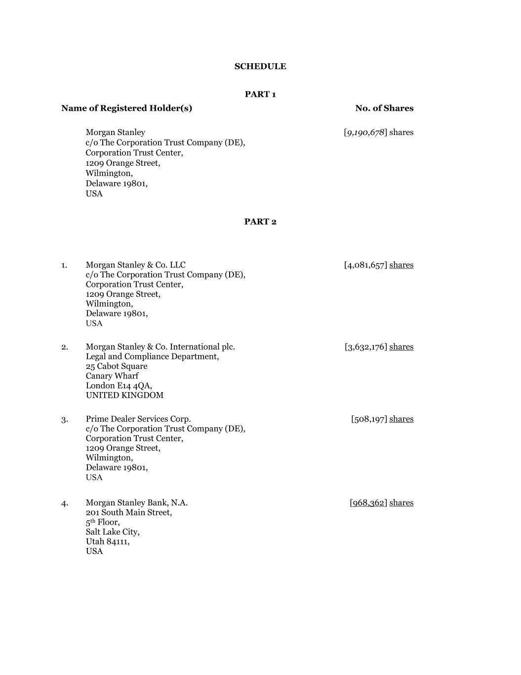 SCHEDULE PART 1 Name of Registered Holder(s) No. of Shares Morgan Stanley [9,190,678] shares c/o The Corporation Trust Company (DE), Corporation Trust Center, 1209 Orange Street, Wilmington, Delaware 19801, USA PART 2 1. Morgan Stanley & Co. LLC [4,081,657] shares c/o The Corporation Trust Company (DE), Corporation Trust Center, 1209 Orange Street, Wilmington, Delaware 19801, USA 2. Morgan Stanley & Co. International plc. [3,632,176] shares Legal and Compliance Department, 25 Cabot Square Canary Wharf London E14 4QA, UNITED KINGDOM 3. Prime Dealer Services Corp. [508,197] shares c/o The Corporation Trust Company (DE), Corporation Trust Center, 1209 Orange Street, Wilmington, Delaware 19801, USA 4. Morgan Stanley Bank, N.A. [968,362] shares 201 South Main Street, 5th Floor, Salt Lake City, Utah 84111, USA