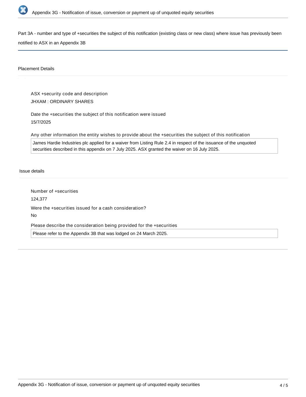 Appendix 3G - Notification of issue, conversion or payment up of unquoted equity securities Appendix 3G - Notification of issue, conversion or payment up of unquoted equity securities 4 / 5 Part 3A - number and type of +securities the subject of this notification (existing class or new class) where issue has previously been notified to ASX in an Appendix 3B Placement Details ASX +security code and description JHXAM : ORDINARY SHARES Date the +securities the subject of this notification were issued 15/7/2025 Any other information the entity wishes to provide about the +securities the subject of this notification James Hardie Industries plc applied for a waiver from Listing Rule 2.4 in respect of the issuance of the unquoted securities described in this appendix on 7 July 2025. ASX granted the waiver on 16 July 2025. Issue details Number of +securities 124,377 Were the +securities issued for a cash consideration? Please describe the consideration being provided for the +securities Please refer to the Appendix 3B that was lodged on 24 March 2025. No