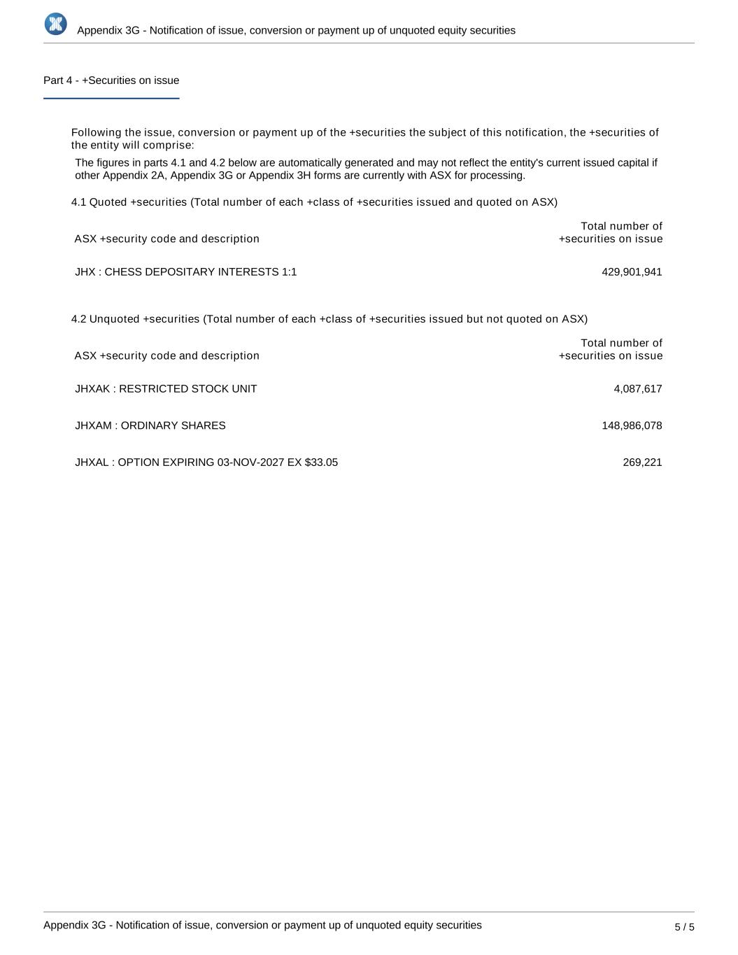 Appendix 3G - Notification of issue, conversion or payment up of unquoted equity securities Appendix 3G - Notification of issue, conversion or payment up of unquoted equity securities 5 / 5 Part 4 - +Securities on issue Following the issue, conversion or payment up of the +securities the subject of this notification, the +securities of the entity will comprise: The figures in parts 4.1 and 4.2 below are automatically generated and may not reflect the entity's current issued capital if other Appendix 2A, Appendix 3G or Appendix 3H forms are currently with ASX for processing. 4.1 Quoted +securities (Total number of each +class of +securities issued and quoted on ASX) ASX +security code and description Total number of +securities on issue JHX : CHESS DEPOSITARY INTERESTS 1:1 429,901,941 4.2 Unquoted +securities (Total number of each +class of +securities issued but not quoted on ASX) ASX +security code and description Total number of +securities on issue JHXAK : RESTRICTED STOCK UNIT 4,087,617 JHXAM : ORDINARY SHARES 148,986,078 JHXAL : OPTION EXPIRING 03-NOV-2027 EX $33.05 269,221