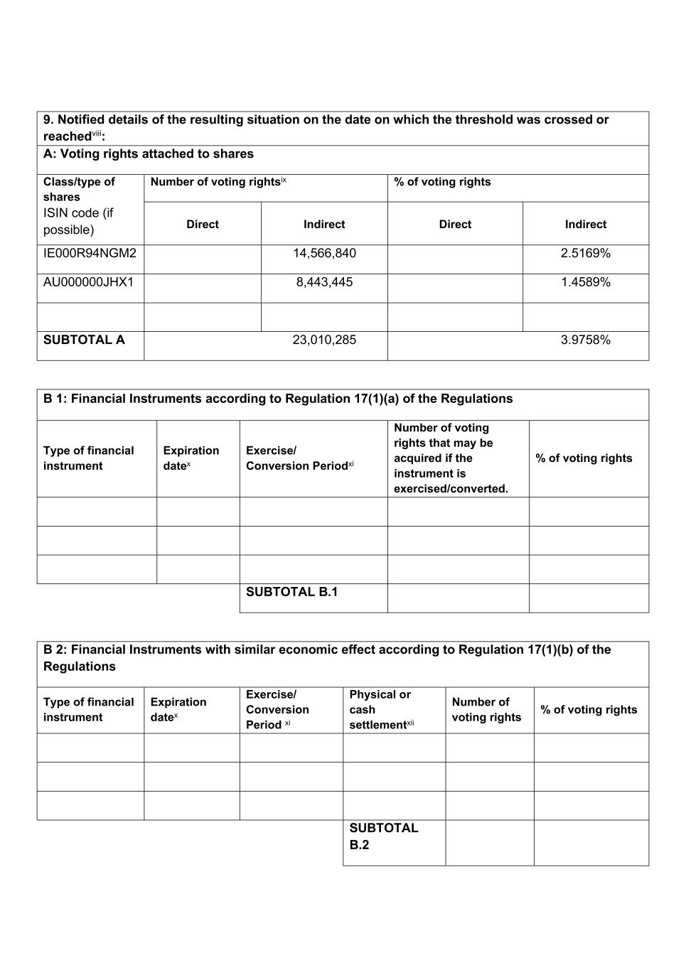 9. Notified details of the resulting situation on the date on which the threshold was crossed or reachedviii: A: Voting rights attached to shares Class/type of shares ISIN code (if possible) Number of voting rightsix % of voting rights Direct Indirect Direct Indirect IE000R94NGM2 14,566,840 2.5169% AU000000JHX1 8,443,445 1.4589% SUBTOTAL A 23,010,285 3.9758% B 1: Financial Instruments according to Regulation 17(1)(a) of the Regulations Type of financial instrument Expiration datex Exercise/ Conversion Periodxi Number of voting rights that may be acquired if the instrument is exercised/converted. % of voting rights SUBTOTAL B.1 B 2: Financial Instruments with similar economic effect according to Regulation 17(1)(b) of the Regulations Type of financial instrument Expiration datex Exercise/ Conversion Period xi Physical or cash settlementxii Number of voting rights % of voting rights SUBTOTAL B.2