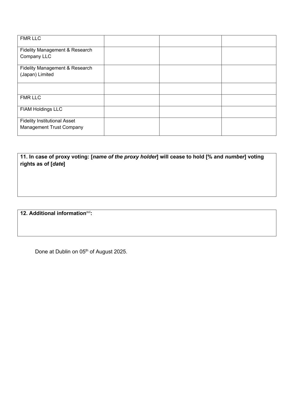 FMR LLC Fidelity Management & Research Company LLC Fidelity Management & Research (Japan) Limited FMR LLC FIAM Holdings LLC Fidelity Institutional Asset Management Trust Company 11. In case of proxy voting: [name of the proxy holder] will cease to hold [% and number] voting rights as of [date] 12. Additional informationxvi: Done at Dublin on 05th of August 2025.