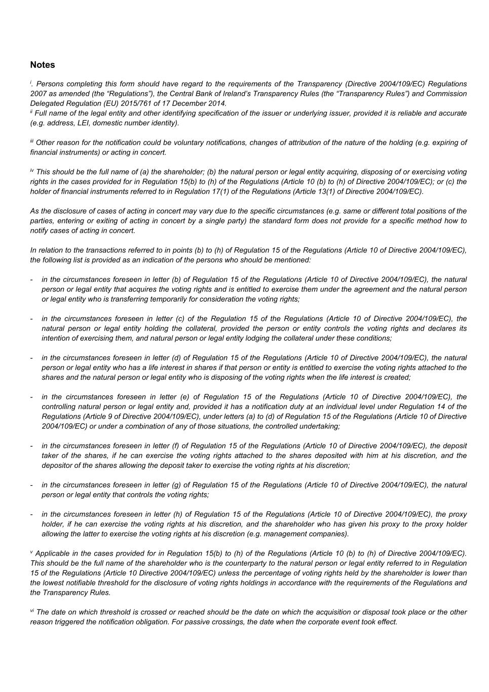 Notes i. Persons completing this form should have regard to the requirements of the Transparency (Directive 2004/109/EC) Regulations 2007 as amended (the “Regulations”), the Central Bank of Ireland’s Transparency Rules (the “Transparency Rules”) and Commission Delegated Regulation (EU) 2015/761 of 17 December 2014. ii Full name of the legal entity and other identifying specification of the issuer or underlying issuer, provided it is reliable and accurate (e.g. address, LEI, domestic number identity). iii Other reason for the notification could be voluntary notifications, changes of attribution of the nature of the holding (e.g. expiring of financial instruments) or acting in concert. iv This should be the full name of (a) the shareholder; (b) the natural person or legal entity acquiring, disposing of or exercising voting rights in the cases provided for in Regulation 15(b) to (h) of the Regulations (Article 10 (b) to (h) of Directive 2004/109/EC); or (c) the holder of financial instruments referred to in Regulation 17(1) of the Regulations (Article 13(1) of Directive 2004/109/EC). As the disclosure of cases of acting in concert may vary due to the specific circumstances (e.g. same or different total positions of the parties, entering or exiting of acting in concert by a single party) the standard form does not provide for a specific method how to notify cases of acting in concert. In relation to the transactions referred to in points (b) to (h) of Regulation 15 of the Regulations (Article 10 of Directive 2004/109/EC), the following list is provided as an indication of the persons who should be mentioned: - in the circumstances foreseen in letter (b) of Regulation 15 of the Regulations (Article 10 of Directive 2004/109/EC), the natural person or legal entity that acquires the voting rights and is entitled to exercise them under the agreement and the natural person or legal entity who is transferring temporarily for consideration the voting rights; - in the circumstances foreseen in letter (c) of the Regulation 15 of the Regulations (Article 10 of Directive 2004/109/EC), the natural person or legal entity holding the collateral, provided the person or entity controls the voting rights and declares its intention of exercising them, and natural person or legal entity lodging the collateral under these conditions; - in the circumstances foreseen in letter (d) of Regulation 15 of the Regulations (Article 10 of Directive 2004/109/EC), the natural person or legal entity who has a life interest in shares if that person or entity is entitled to exercise the voting rights attached to the shares and the natural person or legal entity who is disposing of the voting rights when the life interest is created; - in the circumstances foreseen in letter (e) of Regulation 15 of the Regulations (Article 10 of Directive 2004/109/EC), the controlling natural person or legal entity and, provided it has a notification duty at an individual level under Regulation 14 of the Regulations (Article 9 of Directive 2004/109/EC), under letters (a) to (d) of Regulation 15 of the Regulations (Article 10 of Directive 2004/109/EC) or under a combination of any of those situations, the controlled undertaking; - in the circumstances foreseen in letter (f) of Regulation 15 of the Regulations (Article 10 of Directive 2004/109/EC), the deposit taker of the shares, if he can exercise the voting rights attached to the shares deposited with him at his discretion, and the depositor of the shares allowing the deposit taker to exercise the voting rights at his discretion; - in the circumstances foreseen in letter (g) of Regulation 15 of the Regulations (Article 10 of Directive 2004/109/EC), the natural person or legal entity that controls the voting rights; - in the circumstances foreseen in letter (h) of Regulation 15 of the Regulations (Article 10 of Directive 2004/109/EC), the proxy holder, if he can exercise the voting rights at his discretion, and the shareholder who has given his proxy to the proxy holder allowing the latter to exercise the voting rights at his discretion (e.g. management companies). v Applicable in the cases provided for in Regulation 15(b) to (h) of the Regulations (Article 10 (b) to (h) of Directive 2004/109/EC). This should be the full name of the shareholder who is the counterparty to the natural person or legal entity referred to in Regulation 15 of the Regulations (Article 10 Directive 2004/109/EC) unless the percentage of voting rights held by the shareholder is lower than the lowest notifiable threshold for the disclosure of voting rights holdings in accordance with the requirements of the Regulations and the Transparency Rules. vi The date on which threshold is crossed or reached should be the date on which the acquisition or disposal took place or the other reason triggered the notification obligation. For passive crossings, the date when the corporate event took effect.