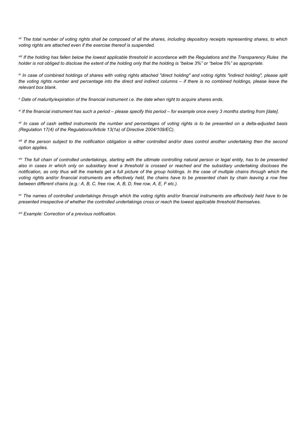 vii The total number of voting rights shall be composed of all the shares, including depository receipts representing shares, to which voting rights are attached even if the exercise thereof is suspended. viii If the holding has fallen below the lowest applicable threshold in accordance with the Regulations and the Transparency Rules the holder is not obliged to disclose the extent of the holding only that the holding is “below 3%” or “below 5%” as appropriate. ix In case of combined holdings of shares with voting rights attached "direct holding" and voting rights "indirect holding", please split the voting rights number and percentage into the direct and indirect columns – if there is no combined holdings, please leave the relevant box blank. x Date of maturity/expiration of the financial instrument i.e. the date when right to acquire shares ends. xi If the financial instrument has such a period – please specify this period – for example once every 3 months starting from [date]. xii In case of cash settled instruments the number and percentages of voting rights is to be presented on a delta-adjusted basis (Regulation 17(4) of the Regulations/Article 13(1a) of Directive 2004/109/EC). xiii If the person subject to the notification obligation is either controlled and/or does control another undertaking then the second option applies. xiv The full chain of controlled undertakings, starting with the ultimate controlling natural person or legal entity, has to be presented also in cases in which only on subsidiary level a threshold is crossed or reached and the subsidiary undertaking discloses the notification, as only thus will the markets get a full picture of the group holdings. In the case of multiple chains through which the voting rights and/or financial instruments are effectively held, the chains have to be presented chain by chain leaving a row free between different chains (e.g.: A, B, C, free row, A, B, D, free row, A, E, F etc.). xv The names of controlled undertakings through which the voting rights and/or financial instruments are effectively held have to be presented irrespective of whether the controlled undertakings cross or reach the lowest applicable threshold themselves. xvi Example: Correction of a previous notification.