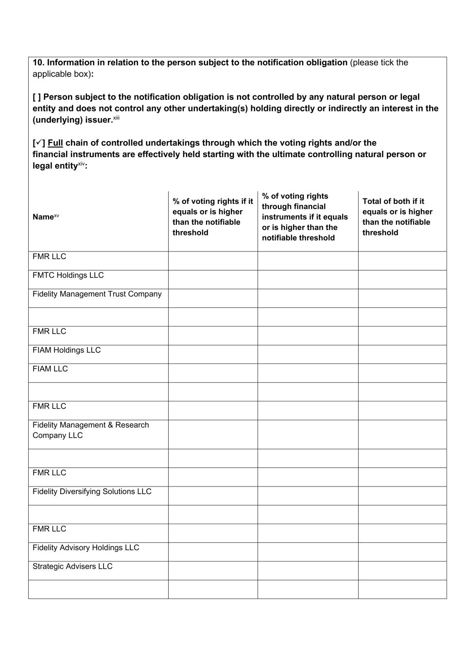10. Information in relation to the person subject to the notification obligation (please tick the applicable box): [ ] Person subject to the notification obligation is not controlled by any natural person or legal entity and does not control any other undertaking(s) holding directly or indirectly an interest in the (underlying) issuer.xiii [] Full chain of controlled undertakings through which the voting rights and/or the financial instruments are effectively held starting with the ultimate controlling natural person or legal entityxiv: Namexv % of voting rights if it equals or is higher than the notifiable threshold % of voting rights through financial instruments if it equals or is higher than the notifiable threshold Total of both if it equals or is higher than the notifiable threshold FMR LLC FMTC Holdings LLC Fidelity Management Trust Company FMR LLC FIAM Holdings LLC FIAM LLC FMR LLC Fidelity Management & Research Company LLC FMR LLC Fidelity Diversifying Solutions LLC FMR LLC Fidelity Advisory Holdings LLC Strategic Advisers LLC