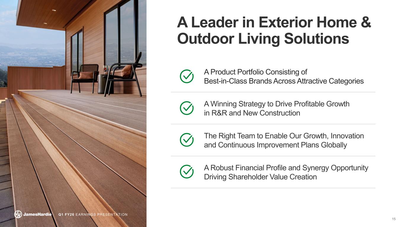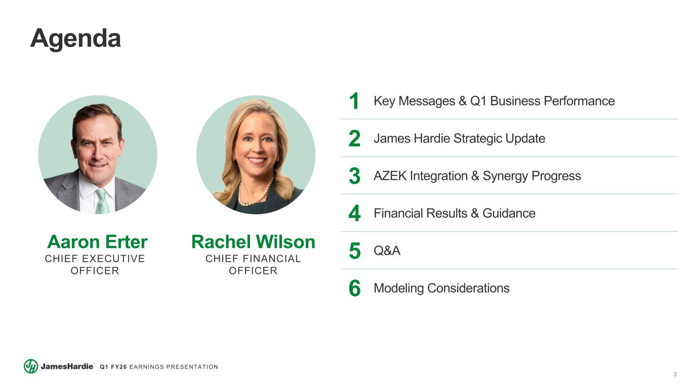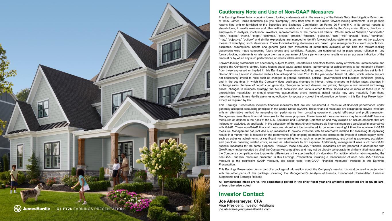 2 Q1 FY26 EARNINGS PRESENTATION Cautionary Note and Use of Non-GAAP Measures This Earnings Presentation contains forward looking statements within the meaning of the Private Securities Litigation Reform Act of 1995. James Hardie Industries plc (the “Company”) may from time to time make forward-looking statements in its periodic reports filed with or furnished to the Securities and Exchange Commission on Forms 20-F and 6-K, in its annual reports to shareholders, in media releases and other written materials and in oral statements made by the Company’s officers, directors or employees to analysts, institutional investors, representatives of the media and others. Words such as “believe,” “anticipate,” “plan,” “expect,” “intend,” “target,” “estimate,” “project,” “predict,” “forecast,” “guideline,” “aim,” “will,” “should,” “likely,” “continue,” “may,” “objective,” “outlook” and similar expressions are intended to identify forward-looking statements but are not the exclusive means of identifying such statements. These forward-looking statements are based upon management's current expectations, estimates, assumptions, beliefs and general good faith evaluation of information available at the time the forward-looking statements were made concerning future events and conditions. Readers are cautioned not to place undue reliance on any forward-looking statements or rely upon them as a guarantee of future performance or results or as an accurate indication of the times at or by which any such performance or results will be achieved. Forward-looking statements are necessarily subject to risks, uncertainties and other factors, many of which are unforeseeable and beyond the Company’s control. Many factors could cause actual results, performance or achievements to be materially different from those expressed or implied in this Earnings Presentation, including, among others, the risks and uncertainties set forth in Section 3 “Risk Factors” in James Hardie’s Annual Report on Form 20-F for the year ended March 31, 2025, which include, but are not necessarily limited to risks such as changes in general economic, political, governmental and business conditions globally and in the countries in which the Company does business; changes in interest rates; changes in inflation rates; changes in exchange rates; the level of construction generally; changes in cement demand and prices; changes in raw material and energy prices; changes in business strategy; the AZEK acquisition and various other factors. Should one or more of these risks or uncertainties materialize, or should underlying assumptions prove incorrect, actual results may vary materially from those described herein. James Hardie assumes no obligation to update or correct the information contained in this Earnings Presentation except as required by law. This Earnings Presentation includes financial measures that are not considered a measure of financial performance under generally accepted accounting principles in the United States (GAAP). These financial measures are designed to provide investors with an alternative method for assessing our performance from on-going operations, capital efficiency and profit generation. Management uses these financial measures for the same purposes. These financial measures are or may be non-GAAP financial measures as defined in the rules of the U.S. Securities and Exchange Commission and may exclude or include amounts that are included or excluded, as applicable, in the calculation of the most directly comparable financial measures calculated in accordance with GAAP. These non-GAAP financial measures should not be considered to be more meaningful than the equivalent GAAP measure. Management has included such measures to provide investors with an alternative method for assessing its operating results in a manner that is focused on the performance of its ongoing operations and excludes the impact of certain legacy items, such as asbestos adjustments, or significant non-recurring items, such as asset impairments, restructuring expenses, acquisition and pre-close financing related costs, as well as adjustments to tax expense. Additionally, management uses such non-GAAP financial measures for the same purposes. However, these non-GAAP financial measures are not prepared in accordance with GAAP, may not be reported by all of the Company’s competitors and may not be directly comparable to similarly titled measures of the Company’s competitors due to potential differences in the exact method of calculation. For additional information regarding the non-GAAP financial measures presented in this Earnings Presentation, including a reconciliation of each non-GAAP financial measure to the equivalent GAAP measure, see slides titled “Non-GAAP Financial Measures” included in this Earnings Presentation. This Earnings Presentation forms part of a package of information about the Company’s results. It should be read in conjunction with the other parts of this package, including the Management’s Analysis of Results, Condensed Consolidated Financial Statements and Earnings Release All comparisons made are vs. the comparable period in the prior fiscal year and amounts presented are in US dollars, unless otherwise noted. Investor Contact Joe Ahlersmeyer, CFA Vice President, Investor Relations joe.ahlersmeyer@jameshardie.com