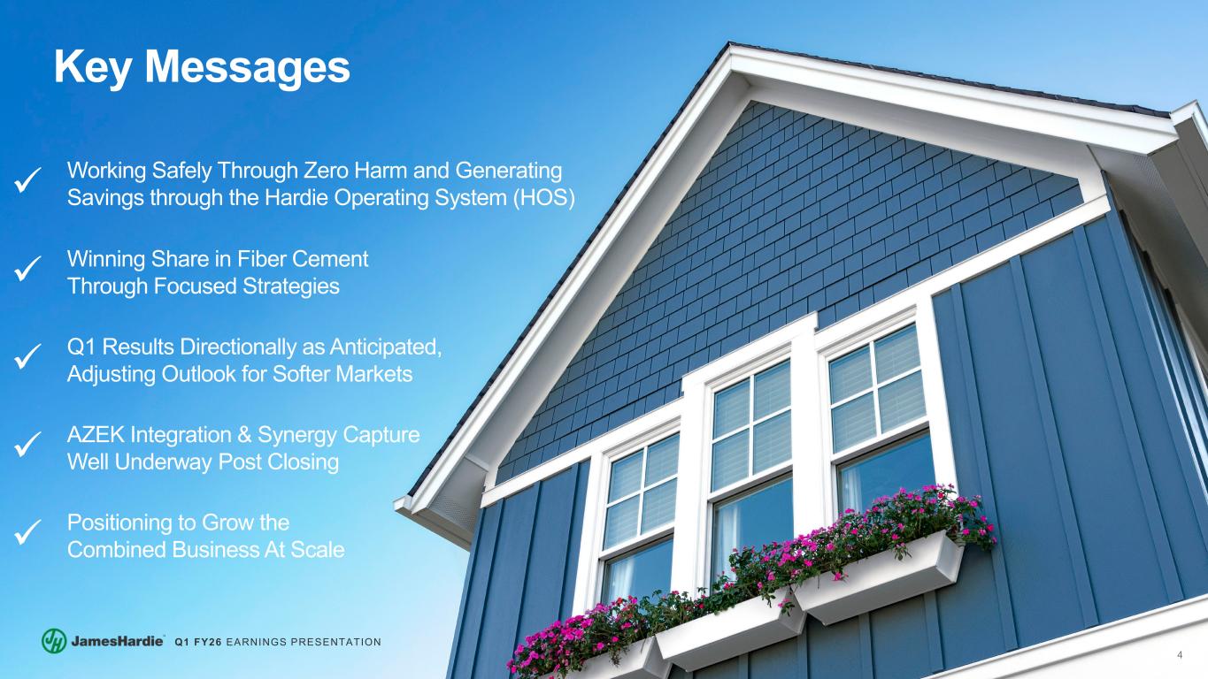3 Q1 FY26 EARNINGS PRESENTATION Agenda Aaron Erter CHIEF EXECUTIVE OFFICER Rachel Wilson CHIEF FINANCIAL OFFICER 1 Key Messages & Q1 Business Performance 2 James Hardie Strategic Update 3 AZEK Integration & Synergy Progress 4 Financial Results & Guidance 5 Q&A 6 Modeling Considerations