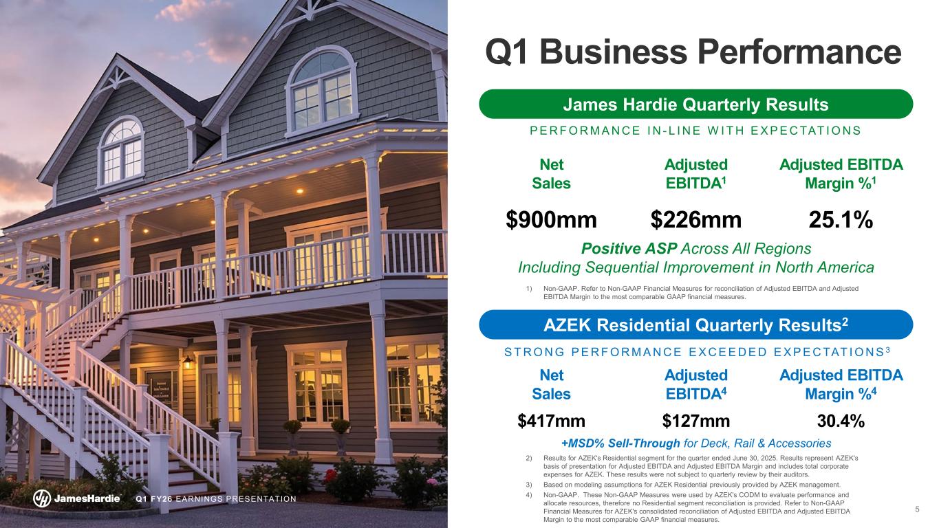 4 Q1 FY26 EARNINGS PRESENTATION Key Messages  Working Safely Through Zero Harm and Generating Savings through the Hardie Operating System (HOS)  Winning Share in Fiber Cement Through Focused Strategies  Q1 Results Directionally as Anticipated, Adjusting Outlook for Softer Markets  AZEK Integration & Synergy Capture Well Underway Post Closing  Positioning to Grow the Combined Business At Scale