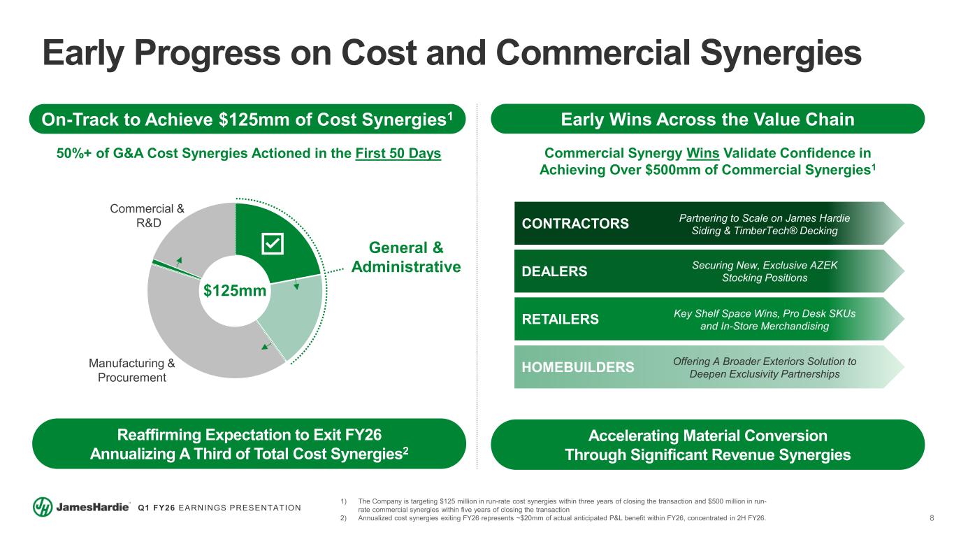 7 Q1 FY26 EARNINGS PRESENTATION Positioning to Grow At Scale Pillars of Our Integration Plan Engage Our Customers​ Key Focus Areas:  The Value Proposition of Our Products & Solutions  The Breadth of Our Combined Product Portfolio  The Shared Opportunity for Growth Support Our Customers Service Enabled By:  Our Unrivaled, Localized Manufacturing Footprint  Best-in-Class Sales & Customer Support Teams  Continued Product Excellence & Innovation Run Our Operations Organizational Imperatives:  Work Safely Through Zero Harm  Leverage HOS to Drive Continuous Improvement  Peddle & Clutch to Align Spending with Demand Enable Our Business Support Growth Through:  Continued Investment in People & Capabilities  Organizational Clarity & Direction for Our People  Retention of Key Talent & Alignment of Incentives