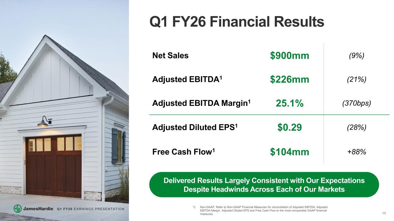 9 Q1 FY26 EARNINGS PRESENTATION Successfully Closed Acquisition of The AZEK® Company First Quarter Results Directionally In Line with Expectations Adjusting North America Outlook for Market Demand and Organic Sales Issuing New FY26 Guidance Reflecting Contribution from AZEK Focused on Successful Integration, Rapidly Actioning Cost Synergies Financial Key Messages