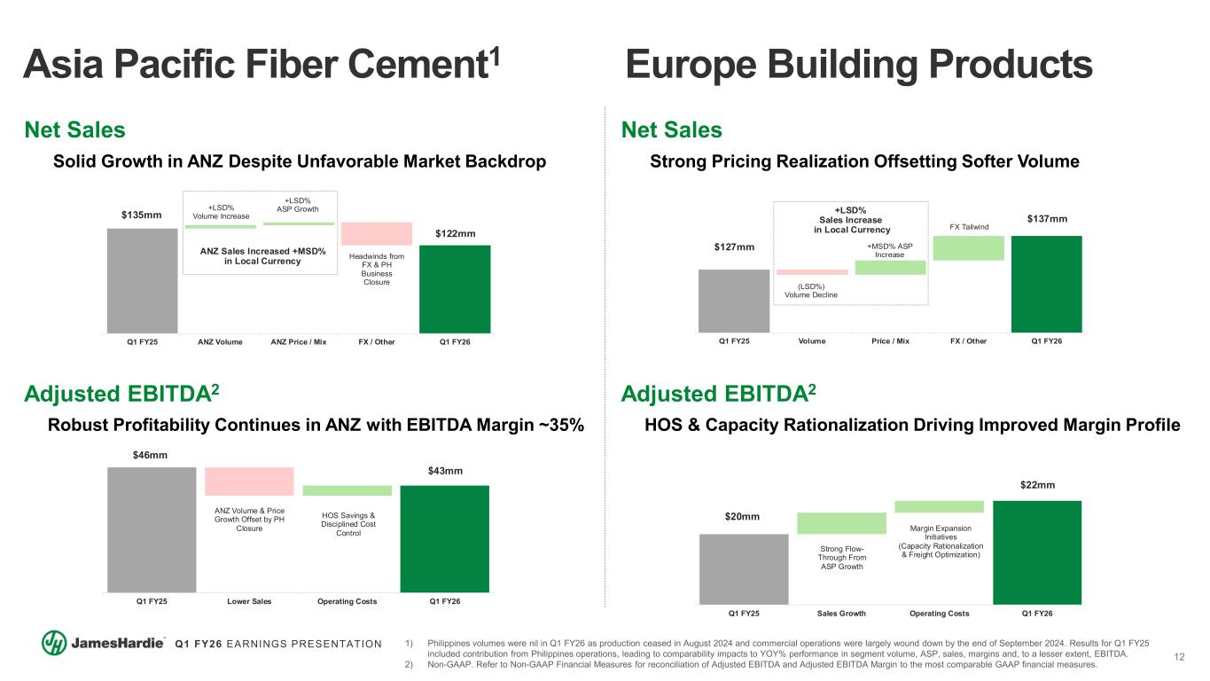 11 Q1 FY26 EARNINGS PRESENTATION $263mm $206mmLower Volumes Partially Offset By Positive ASP Unfavorable Raw Materials & Freight Cost Control Offset By Continued Growth Investments Q1 FY25 Total Sales Impact Manufacturing Costs SG&A Q1 FY26 Net Sales Channel Inventory Volume Impact As Planned For, Primarily Impacting New Construction Geographies  Exteriors volume declined (DD%)  Single-Family exteriors (DD%), primarily due to Texas, Florida and Georgia  Multi-Family volumes +MSD%  Interiors volume declined (DD%)  Sequential improvement in YOY% ASP growth, as expected $729mm $642mm+3% ASP Growth Q1 FY25 Southern Regions All Other Multi-Family & Interiors Price/Mix & Other Q1 FY26 Volumes Down (20%+) Due to Channel Inventory Normalization and Market Softness Volumes Down (10%) Primarily Due to Market Softness Single-Family Exteriors t er e i s1 North America Fiber Cement Focused on Driving ASP Growth & HOS Savings to Offset a Challenging Market Backdrop Adjusted EBITDA2 Focused on Driving Cost Savings to Protect Margins and Mitigate Volume & Inflation Headwinds  Unfavorable volume impact  ~HSD% raw material inflation  Investing in growth and scale while managing margins decisively  Partially offset by ASP growth and manufacturing & procurement HOS savings 1) “Southern Regions” primarily includes Texas, Florida, Georgia, Carolinas, Tennessee and the Gulf and represents ~60% of total single-family exteriors volumes. The remaining ~40% is represented by West, Midwest, Northeast and Canada. 2) Non-GAAP. Refer to Non-GAAP Financial Measures for reconciliation of Adjusted EBITDA to the most comparable GAAP financial measures.