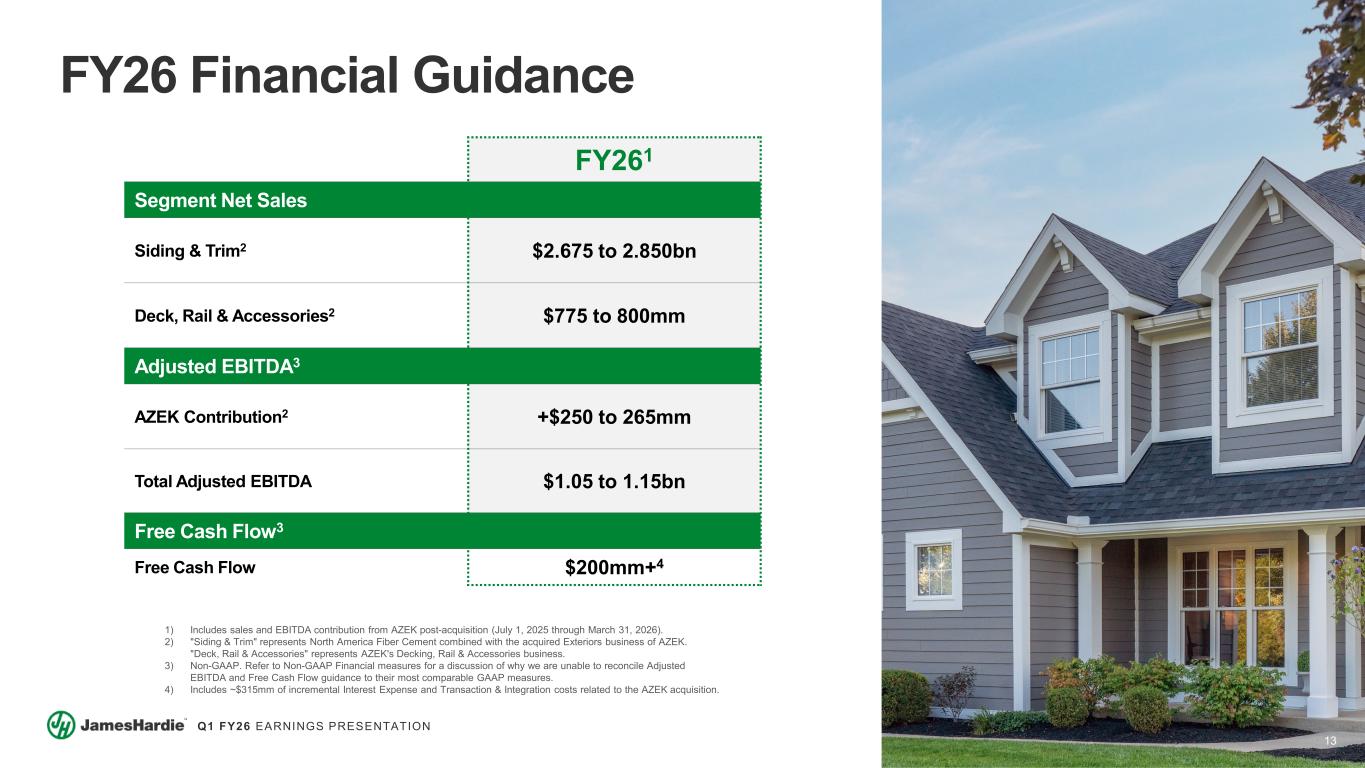12 Q1 FY26 EARNINGS PRESENTATION $135mm ANZ Sales Increased +MSD% in Local Currency $122mm +LSD% Volume Increase +LSD% ASP Growth Headwinds from FX & PH Business Closure Q1 FY25 ANZ Volume ANZ Price / Mix FX / Other Q1 FY26 $127mm +LSD% Sales Increase in Local Currency $137mm (LSD%) Volume Decline +MSD% ASP Increase FX Tailwind Q1 FY25 Volume Price / Mix FX / Other Q1 FY26 $20mm $22mm Strong Flow- Through From ASP Growth Margin Expansion Initiatives (Capacity Rationalization & Freight Optimization) Q1 FY25 Sales Growth Operating Costs Q1 FY26 $46mm $43mm ANZ Volume & Price Growth Offset by PH Closure HOS Savings & Disciplined Cost Control Q1 FY25 Lower Sales Operating Costs Q1 FY26 Asia Pacific Fiber Cement1 Europe Building Products Net Sales Solid Growth in ANZ Despite Unfavorable Market Backdrop Adjusted EBITDA2 Robust Profitability Continues in ANZ with EBITDA Margin ~35% Net Sales Strong Pricing Realization Offsetting Softer Volume Adjusted EBITDA2 HOS & Capacity Rationalization Driving Improved Margin Profile 1) Philippines volumes were nil in Q1 FY26 as production ceased in August 2024 and commercial operations were largely wound down by the end of September 2024. Results for Q1 FY25 included contribution from Philippines operations, leading to comparability impacts to YOY% performance in segment volume, ASP, sales, margins and, to a lesser extent, EBITDA. 2) Non-GAAP. Refer to Non-GAAP Financial Measures for reconciliation of Adjusted EBITDA and Adjusted EBITDA Margin to the most comparable GAAP financial measures.