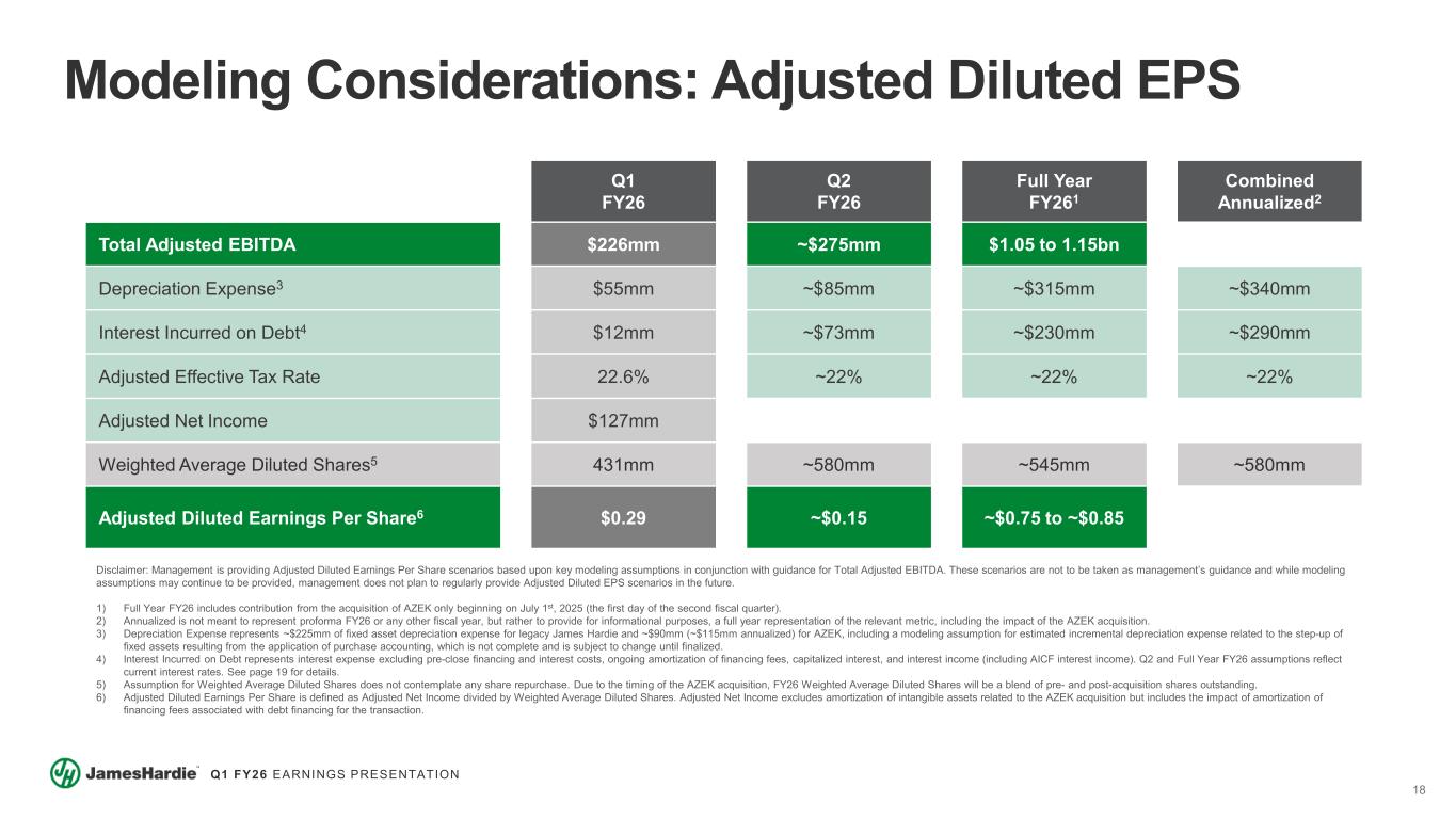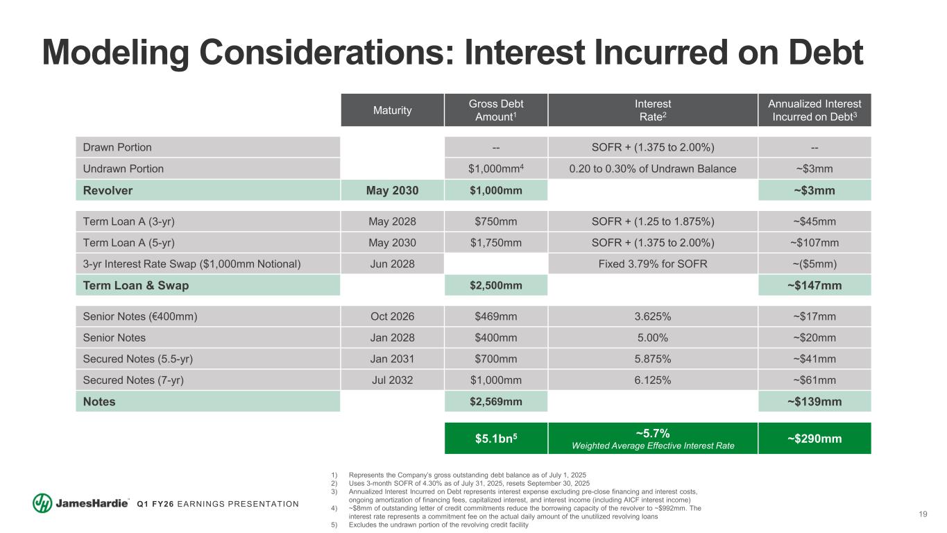 18 Q1 FY26 EARNINGS PRESENTATION Modeling Considerations: Adjusted Diluted EPS Q1 FY26 Q2 FY26 Full Year FY261 Combined Annualized2 Total Adjusted EBITDA $226mm ~$275mm $1.05 to 1.15bn Depreciation Expense3 $55mm ~$85mm ~$315mm ~$340mm Interest Incurred on Debt4 $12mm ~$73mm ~$230mm ~$290mm Adjusted Effective Tax Rate 22.6% ~22% ~22% ~22% Adjusted Net Income $127mm Weighted Average Diluted Shares5 431mm ~580mm ~545mm ~580mm Adjusted Diluted Earnings Per Share6 $0.29 ~$0.15 ~$0.75 to ~$0.85 Disclaimer: Management is providing Adjusted Diluted Earnings Per Share scenarios based upon key modeling assumptions in conjunction with guidance for Total Adjusted EBITDA. These scenarios are not to be taken as management’s guidance and while modeling assumptions may continue to be provided, management does not plan to regularly provide Adjusted Diluted EPS scenarios in the future. 1) Full Year FY26 includes contribution from the acquisition of AZEK only beginning on July 1st, 2025 (the first day of the second fiscal quarter). 2) Annualized is not meant to represent proforma FY26 or any other fiscal year, but rather to provide for informational purposes, a full year representation of the relevant metric, including the impact of the AZEK acquisition. 3) Depreciation Expense represents ~$225mm of fixed asset depreciation expense for legacy James Hardie and ~$90mm (~$115mm annualized) for AZEK, including a modeling assumption for estimated incremental depreciation expense related to the step-up of fixed assets resulting from the application of purchase accounting, which is not complete and is subject to change until finalized. 4) Interest Incurred on Debt represents interest expense excluding pre-close financing and interest costs, ongoing amortization of financing fees, capitalized interest, and interest income (including AICF interest income). Q2 and Full Year FY26 assumptions reflect current interest rates. See page 19 for details. 5) Assumption for Weighted Average Diluted Shares does not contemplate any share repurchase. Due to the timing of the AZEK acquisition, FY26 Weighted Average Diluted Shares will be a blend of pre- and post-acquisition shares outstanding. 6) Adjusted Diluted Earnings Per Share is defined as Adjusted Net Income divided by Weighted Average Diluted Shares. Adjusted Net Income excludes amortization of intangible assets related to the AZEK acquisition but includes the impact of amortization of financing fees associated with debt financing for the transaction.