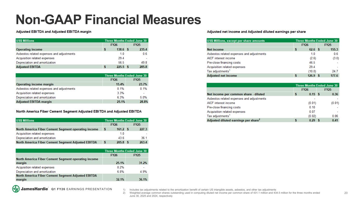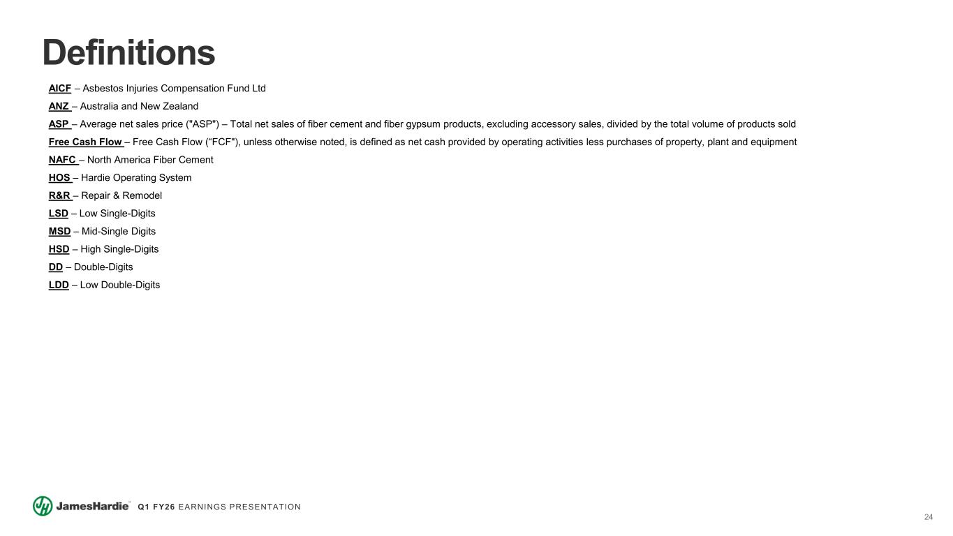 24 Q1 FY26 EARNINGS PRESENTATION Definitions AICF – Asbestos Injuries Compensation Fund Ltd ANZ – Australia and New Zealand ASP – Average net sales price ("ASP") – Total net sales of fiber cement and fiber gypsum products, excluding accessory sales, divided by the total volume of products sold Free Cash Flow – Free Cash Flow (“FCF"), unless otherwise noted, is defined as net cash provided by operating activities less purchases of property, plant and equipment NAFC – North America Fiber Cement HOS – Hardie Operating System R&R – Repair & Remodel LSD – Low Single-Digits MSD – Mid-Single Digits HSD – High Single-Digits DD – Double-Digits LDD – Low Double-Digits