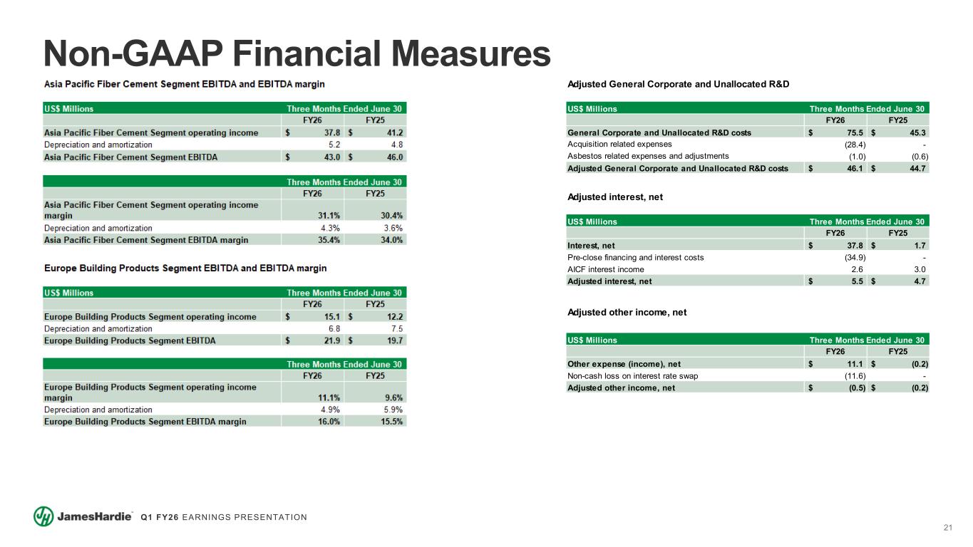 20 Q1 FY26 EARNINGS PRESENTATION Non-GAAP Financial Measures 1) Includes tax adjustments related to the amortization benefit of certain US intangible assets, asbestos, and other tax adjustments 2) Weighted average common shares outstanding used in computing diluted net income per common share of 431.1 million and 434.5 million for the three months ended June 30, 2025 and 2024, respectively