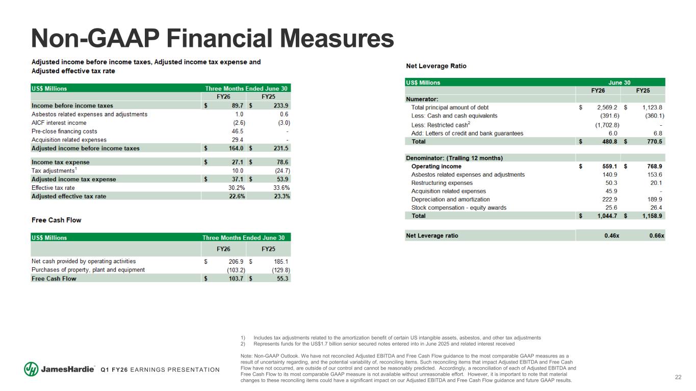 21 Q1 FY26 EARNINGS PRESENTATION Non-GAAP Financial Measures US$ Millions FY26 FY25 General Corporate and Unallocated R&D costs 75.5$ 45.3$ Acquisition related expenses (28.4) - Asbestos related expenses and adjustments (1.0) (0.6) Adjusted General Corporate and Unallocated R&D costs 46.1$ 44.7$ Three Months Ended June 30 Adjusted General Corporate and Unallocated R&D US$ Millions FY26 FY25 Interest, net 37.8$ 1.7$ Pre-close financing and interest costs (34.9) - AICF interest income 2.6 3.0 Adjusted interest, net 5.5$ 4.7$ Adjusted interest, net Three Months Ended June 30 US$ Millions FY26 FY25 Other expense (income), net 11.1$ (0.2)$ Non-cash loss on interest rate swap (11.6) - Adjusted other income, net (0.5)$ (0.2)$ Adjusted other income, net Three Months Ended June 30