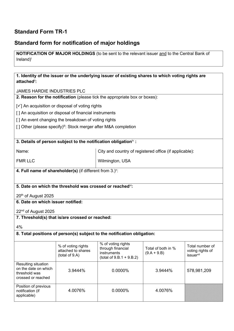 Standard Form TR-1 Standard form for notification of major holdings NOTIFICATION OF MAJOR HOLDINGS (to be sent to the relevant issuer and to the Central Bank of Ireland)i 1. Identity of the issuer or the underlying issuer of existing shares to which voting rights are attachedii: JAMES HARDIE INDUSTRIES PLC 2. Reason for the notification (please tick the appropriate box or boxes): [] An acquisition or disposal of voting rights [ ] An acquisition or disposal of financial instruments [ ] An event changing the breakdown of voting rights [ ] Other (please specify)iii: Stock merger after M&A completion 3. Details of person subject to the notification obligationiv : Name: FMR LLC City and country of registered office (if applicable): Wilmington, USA 4. Full name of shareholder(s) (if different from 3.)v: 5. Date on which the threshold was crossed or reachedvi: 20th of August 2025 6. Date on which issuer notified: 22nd of August 2025 7. Threshold(s) that is/are crossed or reached: 4% 8. Total positions of person(s) subject to the notification obligation: % of voting rights attached to shares (total of 9.A) % of voting rights through financial instruments (total of 9.B.1 + 9.B.2) Total of both in % (9.A + 9.B) Total number of voting rights of issuervii Resulting situation on the date on which threshold was crossed or reached 3.9444% 0.0000% 3.9444% 578,981,209 Position of previous notification (if applicable) 4.0076% 0.0000% 4.0076%