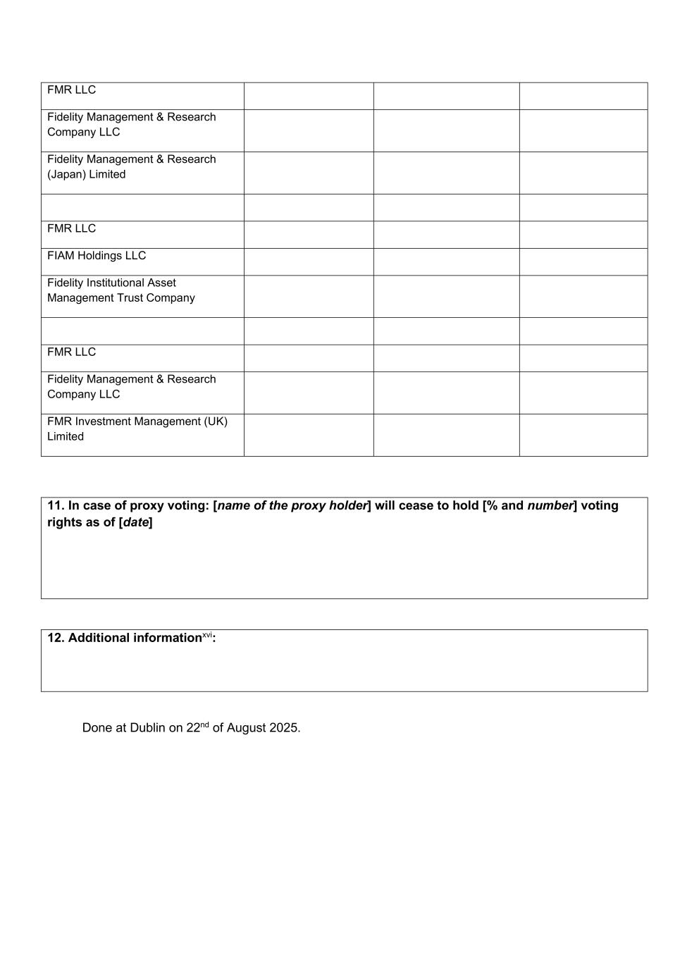 FMR LLC Fidelity Management & Research Company LLC Fidelity Management & Research (Japan) Limited FMR LLC FIAM Holdings LLC Fidelity Institutional Asset Management Trust Company FMR LLC Fidelity Management & Research Company LLC FMR Investment Management (UK) Limited 11. In case of proxy voting: [name of the proxy holder] will cease to hold [% and number] voting rights as of [date] 12. Additional informationxvi: Done at Dublin on 22nd of August 2025.