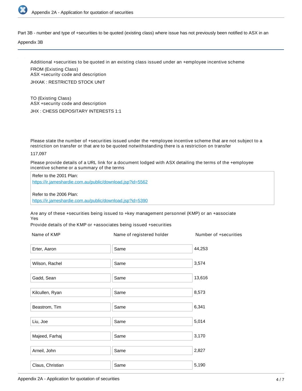 Appendix 2A - Application for quotation of securities Appendix 2A - Application for quotation of securities 4 / 7 Part 3B - number and type of +securities to be quoted (existing class) where issue has not previously been notified to ASX in an Appendix 3B Additional +securities to be quoted in an existing class issued under an +employee incentive scheme FROM (Existing Class) ASX +security code and description JHXAK : RESTRICTED STOCK UNIT TO (Existing Class) ASX +security code and description JHX : CHESS DEPOSITARY INTERESTS 1:1 Please state the number of +securities issued under the +employee incentive scheme that are not subject to a restriction on transfer or that are to be quoted notwithstanding there is a restriction on transfer 117,097 Please provide details of a URL link for a document lodged with ASX detailing the terms of the +employee incentive scheme or a summary of the terms Refer to the 2001 Plan: https://ir.jameshardie.com.au/public/download.jsp?id=5562 Refer to the 2006 Plan: https://ir.jameshardie.com.au/public/download.jsp?id=5390 Are any of these +securities being issued to +key management personnel (KMP) or an +associate Provide details of the KMP or +associates being issued +securities Name of KMP Name of registered holder Number of +securities Erter, Aaron Same 44,253 Wilson, Rachel Same 3,574 Gadd, Sean Same 13,616 Kilcullen, Ryan Same 8,573 Beastrom, Tim Same 6,341 Liu, Joe Same 5,014 Majeed, Farhaj Same 3,170 Arneil, John Same 2,827 Claus, Christian Same 5,190 Yes