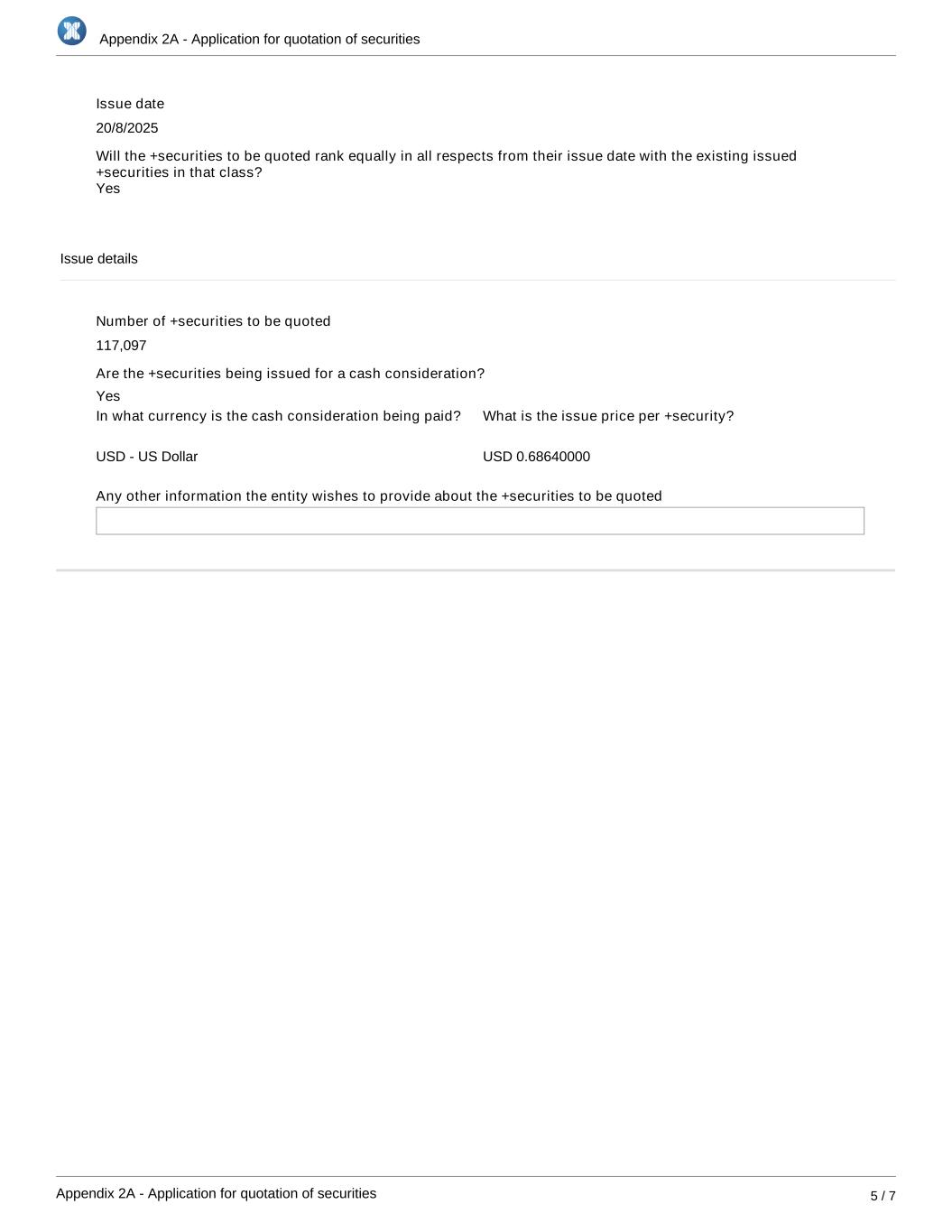 Appendix 2A - Application for quotation of securities Appendix 2A - Application for quotation of securities 5 / 7 Issue date 20/8/2025 Will the +securities to be quoted rank equally in all respects from their issue date with the existing issued +securities in that class? Issue details Number of +securities to be quoted 117,097 Are the +securities being issued for a cash consideration? In what currency is the cash consideration being paid? USD - US Dollar What is the issue price per +security? USD 0.68640000 Any other information the entity wishes to provide about the +securities to be quoted Yes Yes