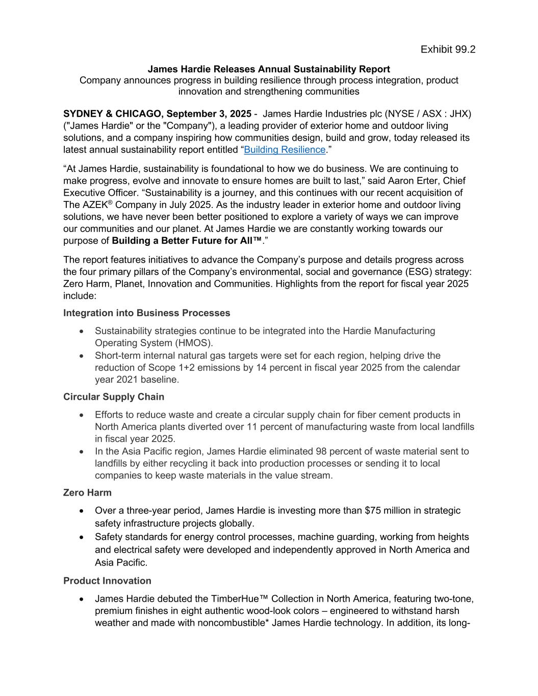 James Hardie Releases Annual Sustainability Report Company announces progress in building resilience through process integration, product innovation and strengthening communities SYDNEY & CHICAGO, September 3, 2025 - James Hardie Industries plc (NYSE / ASX : JHX) ("James Hardie" or the "Company"), a leading provider of exterior home and outdoor living solutions, and a company inspiring how communities design, build and grow, today released its latest annual sustainability report entitled “Building Resilience.” “At James Hardie, sustainability is foundational to how we do business. We are continuing to make progress, evolve and innovate to ensure homes are built to last,” said Aaron Erter, Chief Executive Officer. “Sustainability is a journey, and this continues with our recent acquisition of The AZEK® Company in July 2025. As the industry leader in exterior home and outdoor living solutions, we have never been better positioned to explore a variety of ways we can improve our communities and our planet. At James Hardie we are constantly working towards our purpose of Building a Better Future for All™.” The report features initiatives to advance the Company’s purpose and details progress across the four primary pillars of the Company’s environmental, social and governance (ESG) strategy: Zero Harm, Planet, Innovation and Communities. Highlights from the report for fiscal year 2025 include: Integration into Business Processes • Sustainability strategies continue to be integrated into the Hardie Manufacturing Operating System (HMOS). • Short-term internal natural gas targets were set for each region, helping drive the reduction of Scope 1+2 emissions by 14 percent in fiscal year 2025 from the calendar year 2021 baseline. Circular Supply Chain • Efforts to reduce waste and create a circular supply chain for fiber cement products in North America plants diverted over 11 percent of manufacturing waste from local landfills in fiscal year 2025. • In the Asia Pacific region, James Hardie eliminated 98 percent of waste material sent to landfills by either recycling it back into production processes or sending it to local companies to keep waste materials in the value stream. Zero Harm • Over a three-year period, James Hardie is investing more than $75 million in strategic safety infrastructure projects globally. • Safety standards for energy control processes, machine guarding, working from heights and electrical safety were developed and independently approved in North America and Asia Pacific. Product Innovation • James Hardie debuted the TimberHue™ Collection in North America, featuring two-tone, premium finishes in eight authentic wood-look colors – engineered to withstand harsh weather and made with noncombustible* James Hardie technology. In addition, its long-