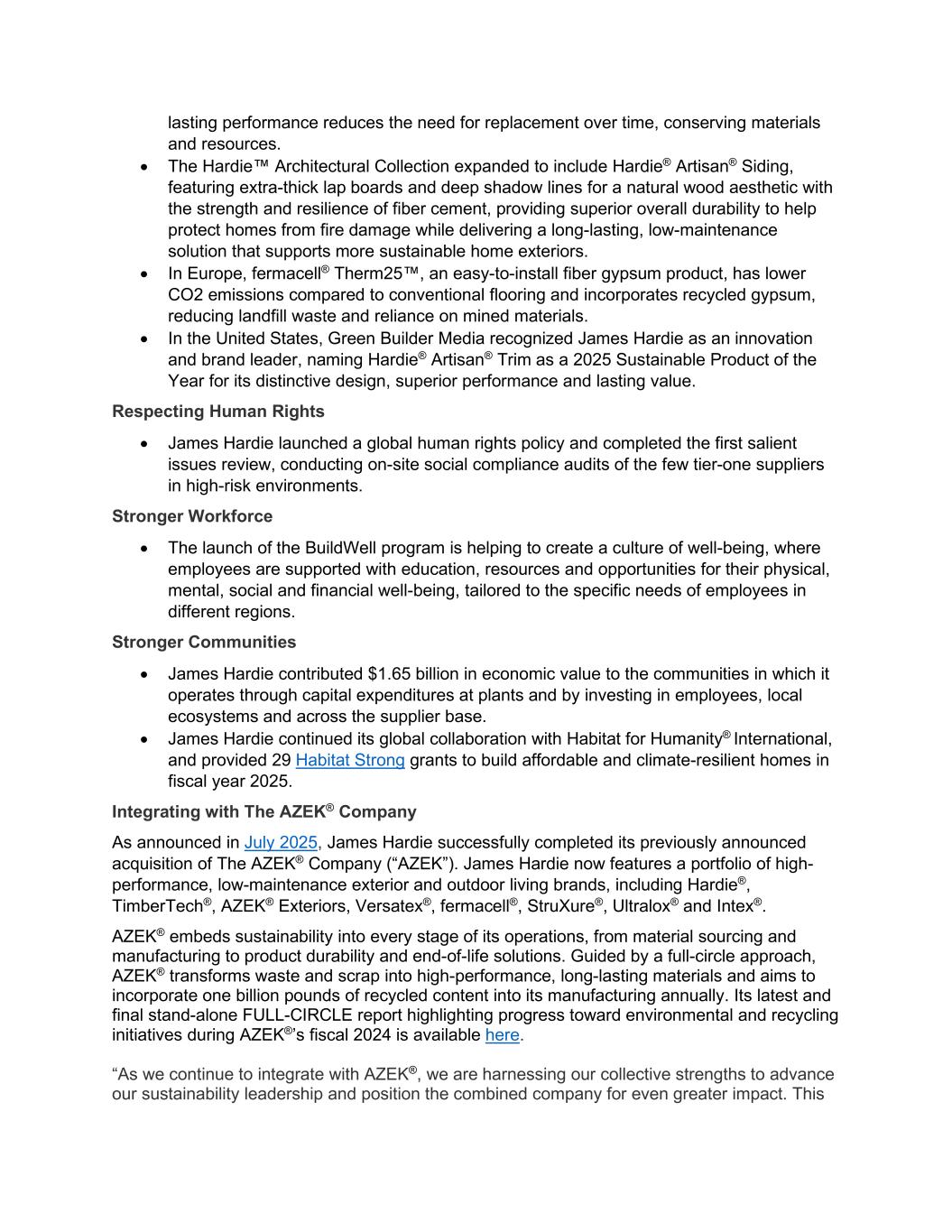 lasting performance reduces the need for replacement over time, conserving materials and resources. • The Hardie™ Architectural Collection expanded to include Hardie® Artisan® Siding, featuring extra-thick lap boards and deep shadow lines for a natural wood aesthetic with the strength and resilience of fiber cement, providing superior overall durability to help protect homes from fire damage while delivering a long-lasting, low-maintenance solution that supports more sustainable home exteriors. • In Europe, fermacell® Therm25™, an easy-to-install fiber gypsum product, has lower CO2 emissions compared to conventional flooring and incorporates recycled gypsum, reducing landfill waste and reliance on mined materials. • In the United States, Green Builder Media recognized James Hardie as an innovation and brand leader, naming Hardie® Artisan® Trim as a 2025 Sustainable Product of the Year for its distinctive design, superior performance and lasting value. Respecting Human Rights • James Hardie launched a global human rights policy and completed the first salient issues review, conducting on-site social compliance audits of the few tier-one suppliers in high-risk environments. Stronger Workforce • The launch of the BuildWell program is helping to create a culture of well-being, where employees are supported with education, resources and opportunities for their physical, mental, social and financial well-being, tailored to the specific needs of employees in different regions. Stronger Communities • James Hardie contributed $1.65 billion in economic value to the communities in which it operates through capital expenditures at plants and by investing in employees, local ecosystems and across the supplier base. • James Hardie continued its global collaboration with Habitat for Humanity® International, and provided 29 Habitat Strong grants to build affordable and climate-resilient homes in fiscal year 2025. Integrating with The AZEK® Company As announced in July 2025, James Hardie successfully completed its previously announced acquisition of The AZEK® Company (“AZEK”). James Hardie now features a portfolio of high- performance, low-maintenance exterior and outdoor living brands, including Hardie®, TimberTech®, AZEK® Exteriors, Versatex®, fermacell®, StruXure®, Ultralox® and Intex®. AZEK® embeds sustainability into every stage of its operations, from material sourcing and manufacturing to product durability and end-of-life solutions. Guided by a full-circle approach, AZEK® transforms waste and scrap into high-performance, long-lasting materials and aims to incorporate one billion pounds of recycled content into its manufacturing annually. Its latest and final stand-alone FULL-CIRCLE report highlighting progress toward environmental and recycling initiatives during AZEK®’s fiscal 2024 is available here. “As we continue to integrate with AZEK®, we are harnessing our collective strengths to advance our sustainability leadership and position the combined company for even greater impact. This