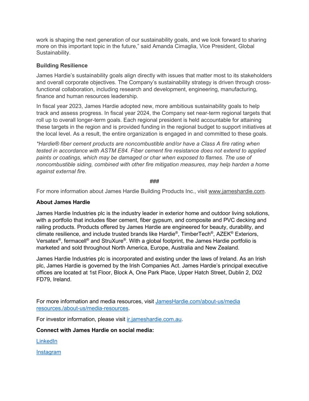 work is shaping the next generation of our sustainability goals, and we look forward to sharing more on this important topic in the future,” said Amanda Cimaglia, Vice President, Global Sustainability. Building Resilience James Hardie’s sustainability goals align directly with issues that matter most to its stakeholders and overall corporate objectives. The Company’s sustainability strategy is driven through cross- functional collaboration, including research and development, engineering, manufacturing, finance and human resources leadership. In fiscal year 2023, James Hardie adopted new, more ambitious sustainability goals to help track and assess progress. In fiscal year 2024, the Company set near-term regional targets that roll up to overall longer-term goals. Each regional president is held accountable for attaining these targets in the region and is provided funding in the regional budget to support initiatives at the local level. As a result, the entire organization is engaged in and committed to these goals. *Hardie® fiber cement products are noncombustible and/or have a Class A fire rating when tested in accordance with ASTM E84. Fiber cement fire resistance does not extend to applied paints or coatings, which may be damaged or char when exposed to flames. The use of noncombustible siding, combined with other fire mitigation measures, may help harden a home against external fire. ### For more information about James Hardie Building Products Inc., visit www.jameshardie.com. About James Hardie James Hardie Industries plc is the industry leader in exterior home and outdoor living solutions, with a portfolio that includes fiber cement, fiber gypsum, and composite and PVC decking and railing products. Products offered by James Hardie are engineered for beauty, durability, and climate resilience, and include trusted brands like Hardie®, TimberTech®, AZEK® Exteriors, Versatex®, fermacell® and StruXure®. With a global footprint, the James Hardie portfolio is marketed and sold throughout North America, Europe, Australia and New Zealand. James Hardie Industries plc is incorporated and existing under the laws of Ireland. As an Irish plc, James Hardie is governed by the Irish Companies Act. James Hardie’s principal executive offices are located at 1st Floor, Block A, One Park Place, Upper Hatch Street, Dublin 2, D02 FD79, Ireland. For more information and media resources, visit JamesHardie.com/about-us/media resources./about-us/media-resources. For investor information, please visit ir.jameshardie.com.au. Connect with James Hardie on social media: LinkedIn Instagram