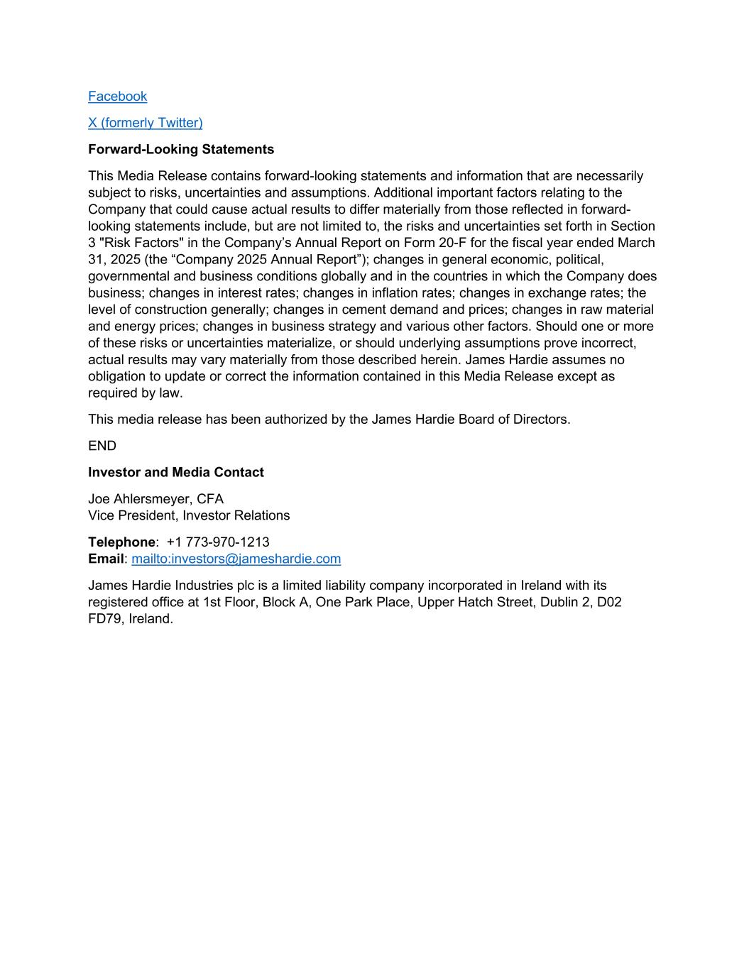 Facebook X (formerly Twitter) Forward-Looking Statements This Media Release contains forward-looking statements and information that are necessarily subject to risks, uncertainties and assumptions. Additional important factors relating to the Company that could cause actual results to differ materially from those reflected in forward- looking statements include, but are not limited to, the risks and uncertainties set forth in Section 3 "Risk Factors" in the Company’s Annual Report on Form 20-F for the fiscal year ended March 31, 2025 (the “Company 2025 Annual Report”); changes in general economic, political, governmental and business conditions globally and in the countries in which the Company does business; changes in interest rates; changes in inflation rates; changes in exchange rates; the level of construction generally; changes in cement demand and prices; changes in raw material and energy prices; changes in business strategy and various other factors. Should one or more of these risks or uncertainties materialize, or should underlying assumptions prove incorrect, actual results may vary materially from those described herein. James Hardie assumes no obligation to update or correct the information contained in this Media Release except as required by law. This media release has been authorized by the James Hardie Board of Directors. END Investor and Media Contact Joe Ahlersmeyer, CFA Vice President, Investor Relations Telephone: +1 773-970-1213 Email: mailto:investors@jameshardie.com James Hardie Industries plc is a limited liability company incorporated in Ireland with its registered office at 1st Floor, Block A, One Park Place, Upper Hatch Street, Dublin 2, D02 FD79, Ireland.