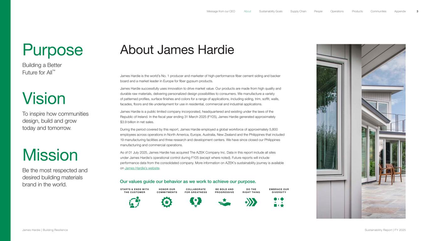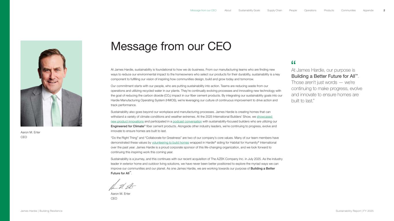Message from our CEO At James Hardie, sustainability is foundational to how we do business. From our manufacturing teams who are finding new ways to reduce our environmental impact to the homeowners who select our products for their durability, sustainability is a key component to fulfilling our vision of inspiring how communities design, build and grow today and tomorrow. Our commitment starts with our people, who are putting sustainability into action. Teams are reducing waste from our operations and utilizing recycled water in our plants. They’re continually evolving processes and innovating new technology with the goal of reducing the carbon dioxide (CO2) impact in our fiber cement products. By integrating our sustainability goals into our Hardie Manufacturing Operating System (HMOS), we're leveraging our culture of continuous improvement to drive action and track performance. Sustainability also goes beyond our workplace and manufacturing processes. James Hardie is creating homes that can withstand a variety of climate conditions and weather extremes. At the 2025 International Builders’ Show, we showcased new product innovations and participated in a podcast conversation with sustainability-focused builders who are utilizing our Engineered for Climate® fiber cement products. Alongside other industry leaders, we’re continuing to progress, evolve and innovate to ensure homes are built to last. “Do the Right Thing” and “Collaborate for Greatness” are two of our company’s core values. Many of our team members have demonstrated these values by volunteering to build homes wrapped in Hardie® siding for Habitat for Humanity® International over the past year. James Hardie is a proud corporate sponsor of this life-changing organization, and we look forward to continuing this inspiring work this coming year. Sustainability is a journey, and this continues with our recent acquisition of The AZEK Company Inc. in July 2025. As the industry leader in exterior home and outdoor living solutions, we have never been better positioned to explore the myriad ways we can improve our communities and our planet. As one James Hardie, we are working towards our purpose of Building a Better Future for All™. Aaron M. Erter CEO Aaron M. Erter CEO At James Hardie, our purpose is Building a Better Future for All™. Those aren't just words — we're continuing to make progress, evolve and innovate to ensure homes are built to last.” 2 James Hardie | Building Resilience Sustainability Repor t | FY 2025 About Sustainability Goals Supply Chain OperationsMessage from our CEO People Products Communities Appendix