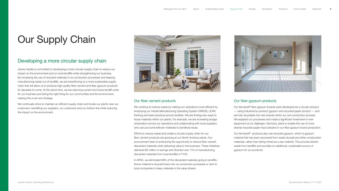 Our Supply Chain Developing a more circular supply chain James Hardie is committed to developing a more circular supply chain to reduce our impact on the environment and on local landfills while strengthening our business. By increasing the use of recycled materials in our production processes and keeping manufacturing waste out of landfills, we are transitioning to a more sustainable supply chain that will allow us to produce high quality fiber cement and fiber gypsum products for decades to come. At the same time, we are reducing current and future landfill costs for our business and doing the right thing for our communities and the environment, making this a win-win strategy. We continually strive to maintain an efficient supply chain and locate our plants near our customers, benefiting our suppliers, our customers and our bottom line while reducing the impact on the environment. Our fiber cement products We continue to reduce waste by making our operations more efficient by employing our Hardie Manufacturing Operating System (HMOS), LEAN thinking and best practices across facilities. We are finding new ways to reuse materials within our plants. For example, we are increasing sludge reclamation across our operations and collaborating with local suppliers who can put some leftover materials to beneficial reuse. Efforts to reduce waste and create a circular supply chain for our fiber cement products are growing at our North America plants. Our procurement team is embracing the opportunity to reduce fiber cement discarded materials while delivering value to the business. These initiatives delivered $2 million in savings and diverted over 11% of manufacturing discarded materials from local landfills in FY25. In APAC, we eliminated 98% of the discarded materials going to landfills. Some material is recycled back into our production processes or sent to local companies to keep materials in the value stream. Our fiber gypsum products Our fermacell® fiber gypsum boards were developed as a circular product — using industrial by-product gypsum and recycled paper product — and are fully recyclable into new boards within our own production process. We adapted our processes and made a significant investment in new equipment at our Siglingen, Germany, plant to enable the use of more diverse recycled paper input streams in our fiber gypsum board production. Our fermacell® products also use recycled gypsum, which is gypsum material that has been recovered from waste drywall and other construction materials, rather than being mined as a raw material. This process diverts waste from landfills and provides an additional, sustainable source of gypsum for our products. 5 James Hardie | Building Resilience Sustainability Repor t | FY 2025 About Sustainability Goals Supply Chain OperationsMessage from our CEO People Products Communities Appendix