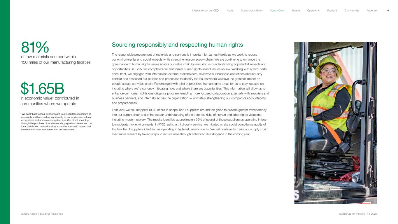 81% of raw materials sourced within 150 miles of our manufacturing facilities Sourcing responsibly and respecting human rights The responsible procurement of materials and services is important for James Hardie as we work to reduce our environmental and social impacts while strengthening our supply chain. We are continuing to enhance the governance of human rights issues across our value chain by maturing our understanding of potential impacts and opportunities. In FY25, we completed our first formal human rights salient issues review. Working with a third-party consultant, we engaged with internal and external stakeholders, reviewed our business operations and industry context and assessed our policies and processes to identify the issues where we have the greatest impact on people across our value chain. We emerged with a list of prioritized human rights areas for us to stay focused on, including where we're currently mitigating risks and where there are opportunities. This information will allow us to enhance our human rights due diligence program, enabling more focused collaboration externally with suppliers and business partners, and internally across the organization — ultimately strengthening our company’s accountability and preparedness. Last year, we risk mapped 100% of our in-scope Tier 1 suppliers around the globe to provide greater transparency into our supply chain and enhance our understanding of the potential risks of human and labor rights violations, including modern slavery. The results identified approximately 99% of spend of those suppliers as operating in low- to moderate-risk environments. In FY25, using a third-party service, we initiated onsite social compliance audits of the few Tier 1 suppliers identified as operating in high-risk environments. We will continue to make our supply chain even more resilient by taking steps to reduce risks through enhanced due diligence in the coming year. $1.65B in economic value* contributed in communities where we operate * We contribute to local economies through capital expenditure at our plants and by investing significantly in our employees, in local ecosystems and across our supplier base. Our direct spending through the purchase of local materials, payroll and taxes, and our local distribution network makes a positive economic impact that benefits both local economies and our customers. 6 James Hardie | Building Resilience Sustainability Repor t | FY 2025 About Sustainability Goals Supply Chain OperationsMessage from our CEO People Products Communities Appendix