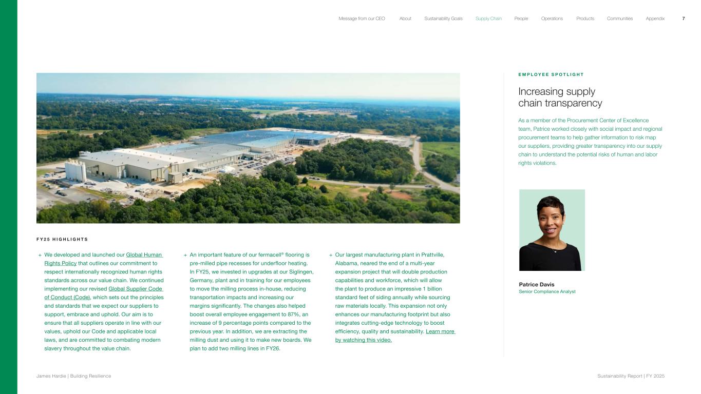E M P L O Y E E S P O T L I G H T Increasing supply chain transparency As a member of the Procurement Center of Excellence team, Patrice worked closely with social impact and regional procurement teams to help gather information to risk map our suppliers, providing greater transparency into our supply chain to understand the potential risks of human and labor rights violations. Patrice Davis Senior Compliance Analyst F Y 2 5 H I G H L I G H T S + We developed and launched our Global Human Rights Policy that outlines our commitment to respect internationally recognized human rights standards across our value chain. We continued implementing our revised Global Supplier Code of Conduct (Code), which sets out the principles and standards that we expect our suppliers to support, embrace and uphold. Our aim is to ensure that all suppliers operate in line with our values, uphold our Code and applicable local laws, and are committed to combating modern slavery throughout the value chain. + An important feature of our fermacell® flooring is pre-milled pipe recesses for underfloor heating. In FY25, we invested in upgrades at our Siglingen, Germany, plant and in training for our employees to move the milling process in-house, reducing transportation impacts and increasing our margins significantly. The changes also helped boost overall employee engagement to 87%, an increase of 9 percentage points compared to the previous year. In addition, we are extracting the milling dust and using it to make new boards. We plan to add two milling lines in FY26. + Our largest manufacturing plant in Prattville, Alabama, neared the end of a multi-year expansion project that will double production capabilities and workforce, which will allow the plant to produce an impressive 1 billion standard feet of siding annually while sourcing raw materials locally. This expansion not only enhances our manufacturing footprint but also integrates cutting-edge technology to boost efficiency, quality and sustainability. Learn more by watching this video. 7 James Hardie | Building Resilience Sustainability Repor t | FY 2025 About Sustainability Goals Supply Chain OperationsMessage from our CEO People Products Communities Appendix