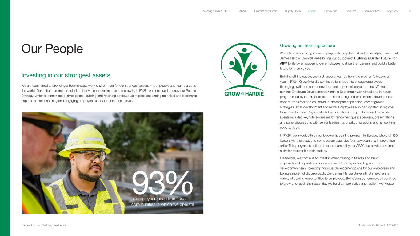 Our People Investing in our strongest assets We are committed to providing a best-in-class work environment for our strongest assets — our people and teams around the world. Our culture promotes inclusion, innovation, performance and growth. In FY25, we continued to grow our People Strategy, which is comprised of three pillars: building and retaining a robust talent pool, expanding technical and leadership capabilities, and inspiring and engaging employees to enable their best selves. 93% of employees hired from local communities in which we operate Growing our learning culture We believe in investing in our employees to help them develop satisfying careers at James Hardie. Grow@Hardie brings our purpose of Building a Better Future For All™ to life by empowering our employees to drive their careers and build a better future for themselves. Building off the successes and lessons learned from the program’s inaugural year in FY24, Grow@Hardie continued its mission to engage employees through growth and career development opportunities year-round. We held our first Employee Development Month in September with virtual and in-house programs led by expert instructors. The learning and professional development opportunities focused on individual development planning, career growth strategies, skills development and more. Employees also participated in regional Core Development Days hosted at all our offices and plants around the world. Events included keynote addresses by renowned guest speakers, presentations and panel discussions with senior leadership, breakout sessions and networking opportunities. In FY25, we invested in a new leadership training program in Europe, where all 150 leaders were expected to complete an extensive four-day course to improve their skills. This program is built on lessons learned by our APAC team, who developed a similar training for their leaders. Meanwhile, we continue to invest in other training initiatives and build organizational capabilities across our workforce by expanding our talent development team, creating individual development plans for our employees and taking a more holistic approach. Our James Hardie University Online offers a variety of training opportunities to employees. By helping our employees continue to grow and reach their potential, we build a more stable and resilient workforce. 8 James Hardie | Building Resilience Sustainability Repor t | FY 2025 About Sustainability Goals Supply Chain OperationsMessage from our CEO People Products Communities Appendix