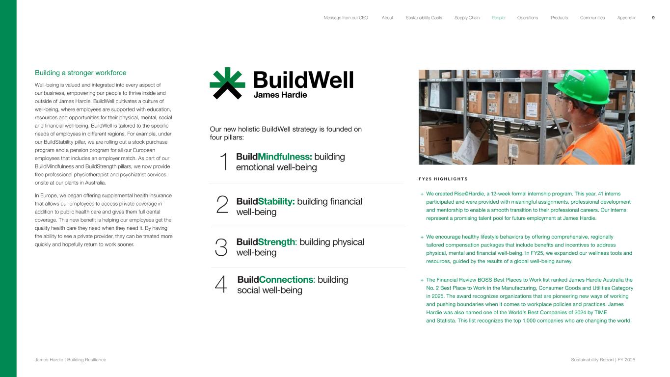 Building a stronger workforce Well-being is valued and integrated into every aspect of our business, empowering our people to thrive inside and outside of James Hardie. BuildWell cultivates a culture of well-being, where employees are supported with education, resources and opportunities for their physical, mental, social and financial well-being. BuildWell is tailored to the specific needs of employees in different regions. For example, under our BuildStability pillar, we are rolling out a stock purchase program and a pension program for all our European employees that includes an employer match. As part of our BuildMindfulness and BuildStrength pillars, we now provide free professional physiotherapist and psychiatrist services onsite at our plants in Australia. In Europe, we began offering supplemental health insurance that allows our employees to access private coverage in addition to public health care and gives them full dental coverage. This new benefit is helping our employees get the quality health care they need when they need it. By having the ability to see a private provider, they can be treated more quickly and hopefully return to work sooner. BuildMindfulness: building emotional well-being 2 Our new holistic BuildWell strategy is founded on four pillars: 1 BuildStrength: building physical well-being3 BuildStability: building financial well-being 4 BuildConnections: building social well-being F Y 2 5 H I G H L I G H T S + We created Rise@Hardie, a 12-week formal internship program. This year, 41 interns participated and were provided with meaningful assignments, professional development and mentorship to enable a smooth transition to their professional careers. Our interns represent a promising talent pool for future employment at James Hardie. + We encourage healthy lifestyle behaviors by offering comprehensive, regionally tailored compensation packages that include benefits and incentives to address physical, mental and financial well-being. In FY25, we expanded our wellness tools and resources, guided by the results of a global well-being survey. + The Financial Review BOSS Best Places to Work list ranked James Hardie Australia the No. 2 Best Place to Work in the Manufacturing, Consumer Goods and Utilities Category in 2025. The award recognizes organizations that are pioneering new ways of working and pushing boundaries when it comes to workplace policies and practices. James Hardie was also named one of the World’s Best Companies of 2024 by TIME and Statista. This list recognizes the top 1,000 companies who are changing the world. 9 James Hardie | Building Resilience Sustainability Repor t | FY 2025 About Sustainability Goals Supply Chain OperationsMessage from our CEO People Products Communities Appendix