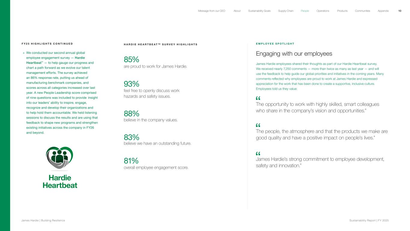 F Y 2 5 H I G H L I G H T S C O N T I N U E D + We conducted our second annual global employee engagement survey — Hardie Heartbeat™ — to help gauge our progress and chart a path forward as we evolve our talent management efforts. The survey achieved an 86% response rate, putting us ahead of manufacturing benchmark companies, and scores across all categories increased over last year. A new People Leadership score comprised of nine questions was included to provide insight into our leaders’ ability to inspire, engage, recognize and develop their organizations and to help hold them accountable. We held listening sessions to discuss the results and are using that feedback to shape new programs and strengthen existing initiatives across the company in FY26 and beyond. H A R D I E H E A R T B E A T ™ S U R V E Y H I G H L I G H T S overall employee engagement score. 85% are proud to work for James Hardie. 93% feel free to openly discuss work hazards and safety issues. 88% believe in the company values. 83% believe we have an outstanding future. 81% E M P L O Y E E S P O T L I G H T Engaging with our employees James Hardie employees shared their thoughts as part of our Hardie Heartbeat survey. We received nearly 7,250 comments — more than twice as many as last year — and will use the feedback to help guide our global priorities and initiatives in the coming years. Many comments reflected why employees are proud to work at James Hardie and expressed appreciation for the work that has been done to create a supportive, inclusive culture. Employees told us they value: The opportunity to work with highly skilled, smart colleagues who share in the company’s vision and opportunities.” The people, the atmosphere and that the products we make are good quality and have a positive impact on people’s lives.” James Hardie’s strong commitment to employee development, safety and innovation.” 10 James Hardie | Building Resilience Sustainability Repor t | FY 2025 About Sustainability Goals Supply Chain OperationsMessage from our CEO People Products Communities Appendix