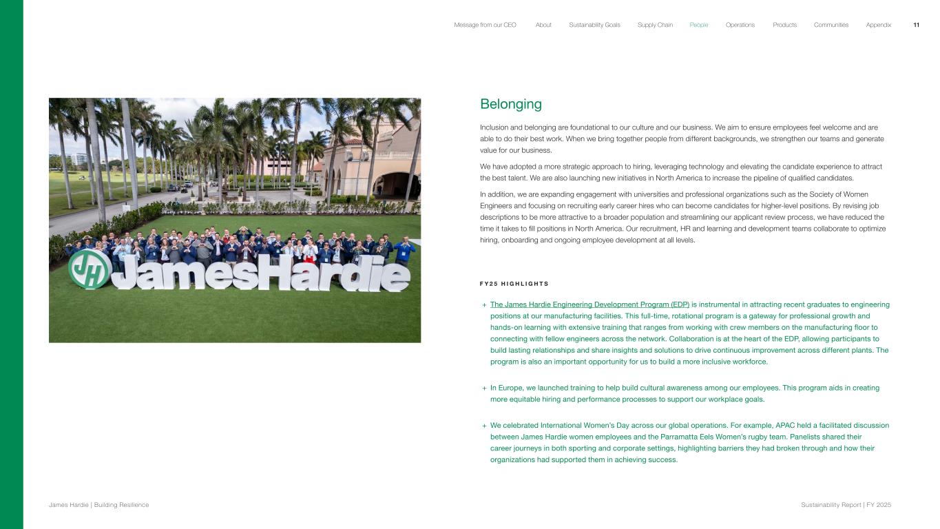 Belonging Inclusion and belonging are foundational to our culture and our business. We aim to ensure employees feel welcome and are able to do their best work. When we bring together people from different backgrounds, we strengthen our teams and generate value for our business. We have adopted a more strategic approach to hiring, leveraging technology and elevating the candidate experience to attract the best talent. We are also launching new initiatives in North America to increase the pipeline of qualified candidates. In addition, we are expanding engagement with universities and professional organizations such as the Society of Women Engineers and focusing on recruiting early career hires who can become candidates for higher-level positions. By revising job descriptions to be more attractive to a broader population and streamlining our applicant review process, we have reduced the time it takes to fill positions in North America. Our recruitment, HR and learning and development teams collaborate to optimize hiring, onboarding and ongoing employee development at all levels. F Y 2 5 H I G H L I G H T S + The James Hardie Engineering Development Program (EDP) is instrumental in attracting recent graduates to engineering positions at our manufacturing facilities. This full-time, rotational program is a gateway for professional growth and hands-on learning with extensive training that ranges from working with crew members on the manufacturing floor to connecting with fellow engineers across the network. Collaboration is at the heart of the EDP, allowing participants to build lasting relationships and share insights and solutions to drive continuous improvement across different plants. The program is also an important opportunity for us to build a more inclusive workforce. + In Europe, we launched training to help build cultural awareness among our employees. This program aids in creating more equitable hiring and performance processes to support our workplace goals. + We celebrated International Women’s Day across our global operations. For example, APAC held a facilitated discussion between James Hardie women employees and the Parramatta Eels Women’s rugby team. Panelists shared their career journeys in both sporting and corporate settings, highlighting barriers they had broken through and how their organizations had supported them in achieving success. 11 James Hardie | Building Resilience Sustainability Repor t | FY 2025 About Sustainability Goals Supply Chain OperationsMessage from our CEO People Products Communities Appendix