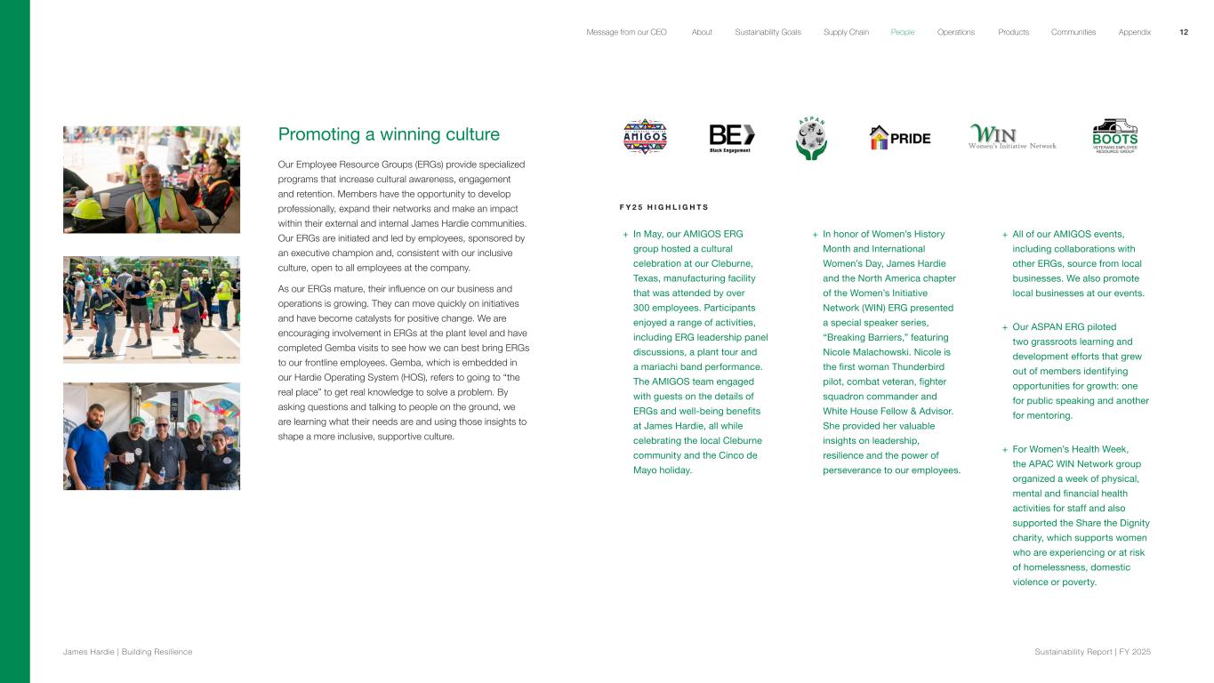 Promoting a winning culture Our Employee Resource Groups (ERGs) provide specialized programs that increase cultural awareness, engagement and retention. Members have the opportunity to develop professionally, expand their networks and make an impact within their external and internal James Hardie communities. Our ERGs are initiated and led by employees, sponsored by an executive champion and, consistent with our inclusive culture, open to all employees at the company. As our ERGs mature, their influence on our business and operations is growing. They can move quickly on initiatives and have become catalysts for positive change. We are encouraging involvement in ERGs at the plant level and have completed Gemba visits to see how we can best bring ERGs to our frontline employees. Gemba, which is embedded in our Hardie Operating System (HOS), refers to going to “the real place” to get real knowledge to solve a problem. By asking questions and talking to people on the ground, we are learning what their needs are and using those insights to shape a more inclusive, supportive culture. F Y 2 5 H I G H L I G H T S + In May, our AMIGOS ERG group hosted a cultural celebration at our Cleburne, Texas, manufacturing facility that was attended by over 300 employees. Participants enjoyed a range of activities, including ERG leadership panel discussions, a plant tour and a mariachi band performance. The AMIGOS team engaged with guests on the details of ERGs and well-being benefits at James Hardie, all while celebrating the local Cleburne community and the Cinco de Mayo holiday. + In honor of Women’s History Month and International Women’s Day, James Hardie and the North America chapter of the Women’s Initiative Network (WIN) ERG presented a special speaker series, “Breaking Barriers,” featuring Nicole Malachowski. Nicole is the first woman Thunderbird pilot, combat veteran, fighter squadron commander and White House Fellow & Advisor. She provided her valuable insights on leadership, resilience and the power of perseverance to our employees. + All of our AMIGOS events, including collaborations with other ERGs, source from local businesses. We also promote local businesses at our events. + Our ASPAN ERG piloted two grassroots learning and development efforts that grew out of members identifying opportunities for growth: one for public speaking and another for mentoring. + For Women’s Health Week, the APAC WIN Network group organized a week of physical, mental and financial health activities for staff and also supported the Share the Dignity charity, which supports women who are experiencing or at risk of homelessness, domestic violence or poverty. 12 James Hardie | Building Resilience Sustainability Repor t | FY 2025 About Sustainability Goals Supply Chain OperationsMessage from our CEO People Products Communities Appendix