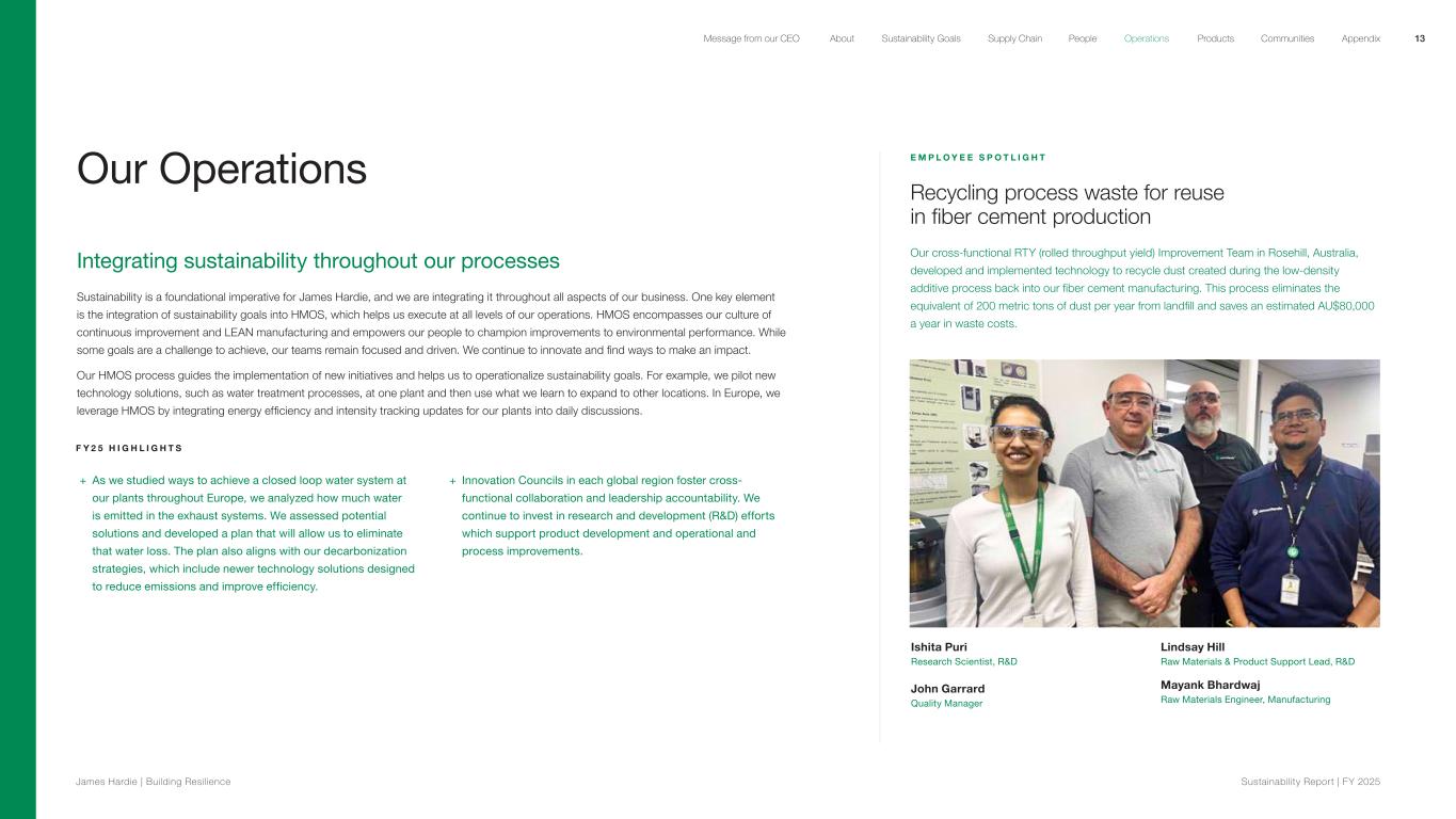 Our Operations Integrating sustainability throughout our processes Sustainability is a foundational imperative for James Hardie, and we are integrating it throughout all aspects of our business. One key element is the integration of sustainability goals into HMOS, which helps us execute at all levels of our operations. HMOS encompasses our culture of continuous improvement and LEAN manufacturing and empowers our people to champion improvements to environmental performance. While some goals are a challenge to achieve, our teams remain focused and driven. We continue to innovate and find ways to make an impact. Our HMOS process guides the implementation of new initiatives and helps us to operationalize sustainability goals. For example, we pilot new technology solutions, such as water treatment processes, at one plant and then use what we learn to expand to other locations. In Europe, we leverage HMOS by integrating energy efficiency and intensity tracking updates for our plants into daily discussions. F Y 2 5 H I G H L I G H T S + As we studied ways to achieve a closed loop water system at our plants throughout Europe, we analyzed how much water is emitted in the exhaust systems. We assessed potential solutions and developed a plan that will allow us to eliminate that water loss. The plan also aligns with our decarbonization strategies, which include newer technology solutions designed to reduce emissions and improve efficiency. + Innovation Councils in each global region foster cross- functional collaboration and leadership accountability. We continue to invest in research and development (R&D) efforts which support product development and operational and process improvements. E M P L O Y E E S P O T L I G H T Recycling process waste for reuse in fiber cement production Our cross-functional RTY (rolled throughput yield) Improvement Team in Rosehill, Australia, developed and implemented technology to recycle dust created during the low-density additive process back into our fiber cement manufacturing. This process eliminates the equivalent of 200 metric tons of dust per year from landfill and saves an estimated AU$80,000 a year in waste costs. Ishita Puri Research Scientist, R&D John Garrard Quality Manager Lindsay Hill Raw Materials & Product Support Lead, R&D Mayank Bhardwaj Raw Materials Engineer, Manufacturing 13 James Hardie | Building Resilience Sustainability Repor t | FY 2025 About Sustainability Goals Supply Chain OperationsMessage from our CEO People Products Communities Appendix