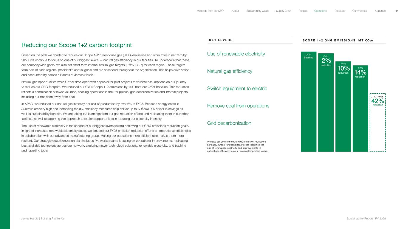 Reducing our Scope 1+2 carbon footprint Based on the path we charted to reduce our Scope 1+2 greenhouse gas (GHG) emissions and work toward net zero by 2050, we continue to focus on one of our biggest levers — natural gas efficiency in our facilities. To underscore that these are companywide goals, we also set short-term internal natural gas targets (FY25-FY27) for each region. These targets form part of each regional president’s annual goals and are cascaded throughout the organization. This helps drive action and accountability across all facets at James Hardie. Natural gas opportunities were further developed with approval for pilot projects to validate assumptions on our journey to reduce our GHG footprint. We reduced our CY24 Scope 1+2 emissions by 14% from our CY21 baseline. This reduction reflects a combination of lower volumes, ceasing operations in the Philippines, grid decarbonization and internal projects, including our transition away from coal. In APAC, we reduced our natural gas intensity per unit of production by over 6% in FY25. Because energy costs in Australia are very high and increasing rapidly, efficiency measures help deliver up to AU$700,000 a year in savings as well as sustainability benefits. We are taking the learnings from our gas reduction efforts and replicating them in our other facilities, as well as applying this approach to explore opportunities in reducing our electricity intensity. The use of renewable electricity is the second of our biggest levers toward achieving our GHG emissions reduction goals. In light of increased renewable electricity costs, we focused our FY25 emission reduction efforts on operational efficiencies in collaboration with our advanced manufacturing group. Making our operations more efficient also makes them more resilient. Our strategic decarbonization plan includes five workstreams focusing on operational improvements, replicating best available technology across our network, exploring newer technology solutions, renewable electricity, and tracking and reporting tools. K E Y L E V E R S S C O P E 1 + 2 G H G E M I S S I O N S M T CO2e CY30 TARGET 42% reduction CY23 10% reduction reduction CY24 14% CY22 CY21 2% reduction Baseline Use of renewable electricity Natural gas efficiency Switch equipment to electric Remove coal from operations Grid decarbonization We take our commitment to GHG emission reductions seriously. Cross-functional task forces identified the use of renewable electricity and improvements in natural gas efficiency as our two most important levers. 14 James Hardie | Building Resilience Sustainability Repor t | FY 2025 About Sustainability Goals Supply Chain OperationsMessage from our CEO People Products Communities Appendix