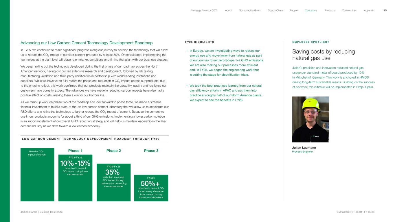 Advancing our Low Carbon Cement Technology Development Roadmap In FY25, we continued to make significant progress along our journey to develop the technology that will allow us to reduce the CO2 impact of our fiber cement products by at least 50%. Once validated, implementing the technology at the plant level will depend on market conditions and timing that align with our business strategy. We began rolling out the technology developed during the first phase of our roadmap across the North American network, having conducted extensive research and development, followed by lab testing, manufacturing validation and third-party certification in partnership with world leading institutions and suppliers. While we have yet to fully realize the phase one reduction in CO2 impact across our products, due to the ongoing rollout, this work confirmed that our products maintain the durability, quality and resilience our customers have come to expect. The advances we have made in reducing carbon impacts have also had a positive effect on costs, making them a win for our bottom line. As we ramp up work on phase two of the roadmap and look forward to phase three, we made a sizeable financial investment to build a state-of-the-art low carbon cement laboratory that will allow us to accelerate our R&D efforts and refine the technology to further reduce the CO2 impact of cement. Because the cement we use in our products accounts for about a third of our GHG emissions, implementing a lower carbon solution is an important element of our overall GHG reduction strategy and will help us maintain leadership in the fiber cement industry as we drive toward a low carbon economy. L O W C A R B O N C E M E N T T E C H N O L O GY D E V E L O P M E N T R O A D M A P T H R O U G H F Y 3 0 F Y 2 5 H I G H L I G H T S + In Europe, we are investigating ways to reduce our energy use and move away from natural gas as part of our journey to net zero Scope 1+2 GHG emissions. We are also making our processes more efficient and, in FY25, we began the engineering work that is setting the stage for electrification trials. + We took the best practices learned from our natural gas efficiency efforts in APAC and put them into practice at roughly half of our North America plants. We expect to see the benefits in FY26. E M P L O Y E E S P O T L I G H T Saving costs by reducing natural gas use Julian’s precision and innovation reduced natural gas usage per standard meter of board produced by 10% in Münchehof, Germany. This work is anchored in HMOS driving long-term sustainable results. Building on the success of his work, this initiative will be implemented in Orejo, Spain. Julian Laumann Process Engineer Baseline CO² impact of cement 10%-15% reduction in cement CO² impact using lower carbon cement FY23-FY25 Phase 1 FY26-FY28 35% reduction in cement CO² impact through partnerships developing low carbon binder Phase 2 FY29+ 50%+ reduction in cement CO² impact using alternative binder created through industry collaborations Phase 3 15 James Hardie | Building Resilience Sustainability Repor t | FY 2025 About Sustainability Goals Supply Chain OperationsMessage from our CEO People Products Communities Appendix
