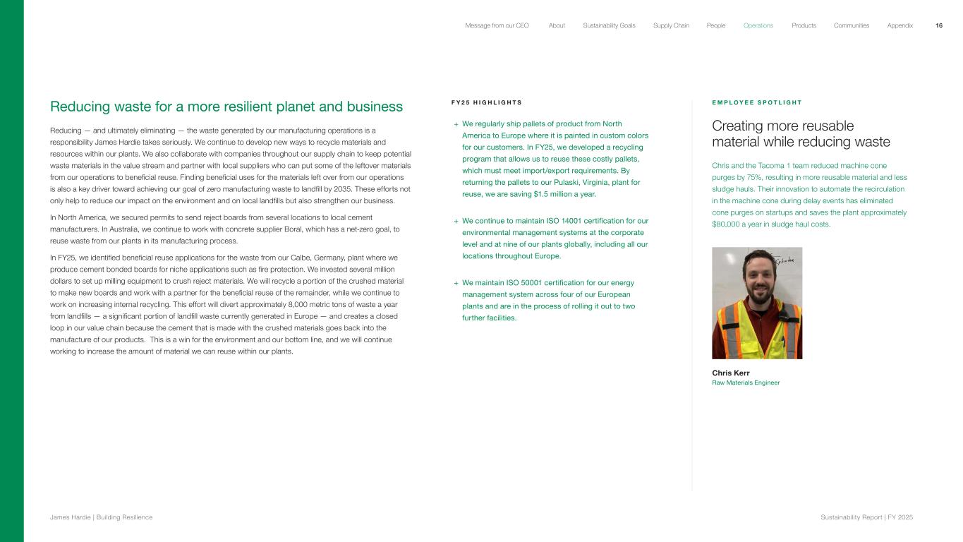 Reducing waste for a more resilient planet and business Reducing — and ultimately eliminating — the waste generated by our manufacturing operations is a responsibility James Hardie takes seriously. We continue to develop new ways to recycle materials and resources within our plants. We also collaborate with companies throughout our supply chain to keep potential waste materials in the value stream and partner with local suppliers who can put some of the leftover materials from our operations to beneficial reuse. Finding beneficial uses for the materials left over from our operations is also a key driver toward achieving our goal of zero manufacturing waste to landfill by 2035. These efforts not only help to reduce our impact on the environment and on local landfills but also strengthen our business. In North America, we secured permits to send reject boards from several locations to local cement manufacturers. In Australia, we continue to work with concrete supplier Boral, which has a net-zero goal, to reuse waste from our plants in its manufacturing process. In FY25, we identified beneficial reuse applications for the waste from our Calbe, Germany, plant where we produce cement bonded boards for niche applications such as fire protection. We invested several million dollars to set up milling equipment to crush reject materials. We will recycle a portion of the crushed material to make new boards and work with a partner for the beneficial reuse of the remainder, while we continue to work on increasing internal recycling. This effort will divert approximately 8,000 metric tons of waste a year from landfills — a significant portion of landfill waste currently generated in Europe — and creates a closed loop in our value chain because the cement that is made with the crushed materials goes back into the manufacture of our products. This is a win for the environment and our bottom line, and we will continue working to increase the amount of material we can reuse within our plants. F Y 2 5 H I G H L I G H T S + We regularly ship pallets of product from North America to Europe where it is painted in custom colors for our customers. In FY25, we developed a recycling program that allows us to reuse these costly pallets, which must meet import/export requirements. By returning the pallets to our Pulaski, Virginia, plant for reuse, we are saving $1.5 million a year. + We continue to maintain ISO 14001 certification for our environmental management systems at the corporate level and at nine of our plants globally, including all our locations throughout Europe. + We maintain ISO 50001 certification for our energy management system across four of our European plants and are in the process of rolling it out to two further facilities. E M P L O Y E E S P O T L I G H T Creating more reusable material while reducing waste Chris and the Tacoma 1 team reduced machine cone purges by 75%, resulting in more reusable material and less sludge hauls. Their innovation to automate the recirculation in the machine cone during delay events has eliminated cone purges on startups and saves the plant approximately $80,000 a year in sludge haul costs. Chris Kerr Raw Materials Engineer 16 James Hardie | Building Resilience Sustainability Repor t | FY 2025 About Sustainability Goals Supply Chain OperationsMessage from our CEO People Products Communities Appendix